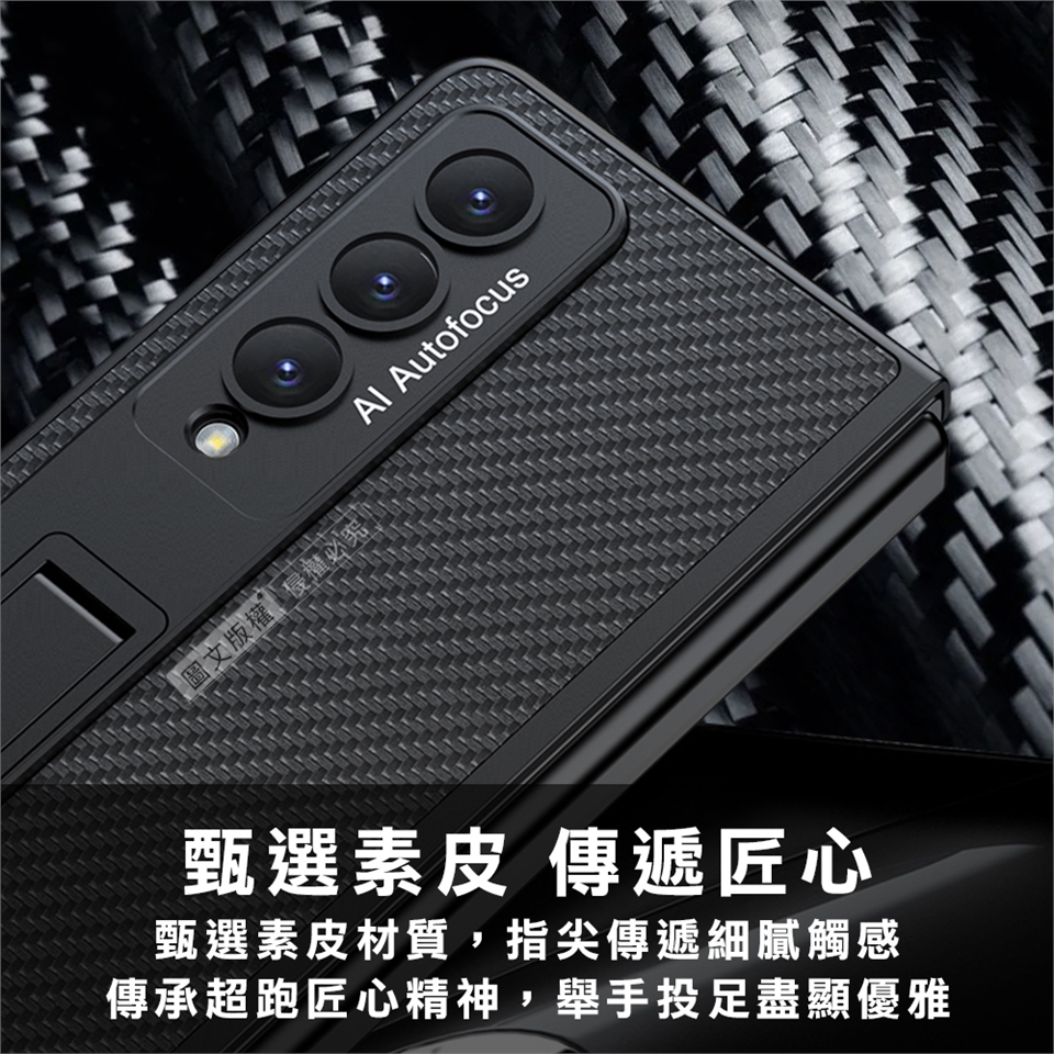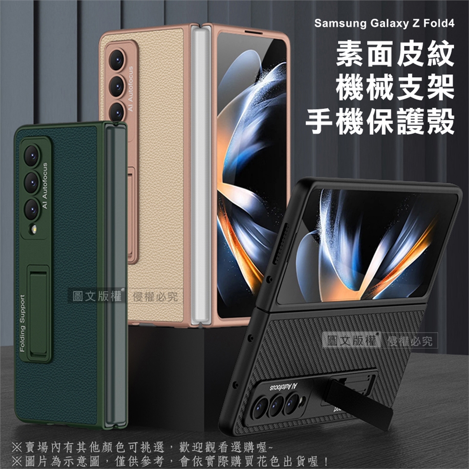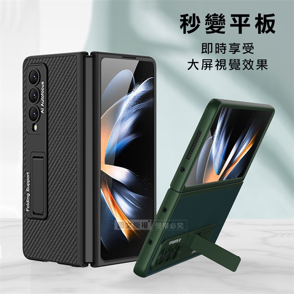 三星 Samsung Galaxy Z Fold4 全包覆皮紋支架保護殼 手機殼(暗夜綠) 圖片與影片為示意圖,僅供參考,將依實際購買花色款式出貨唷! 實際出貨之支架上並無影片中的 "釹磁鐵" 下單前請注意!! 【注意:安裝前先將藍色膠條撕開再裝上手機】