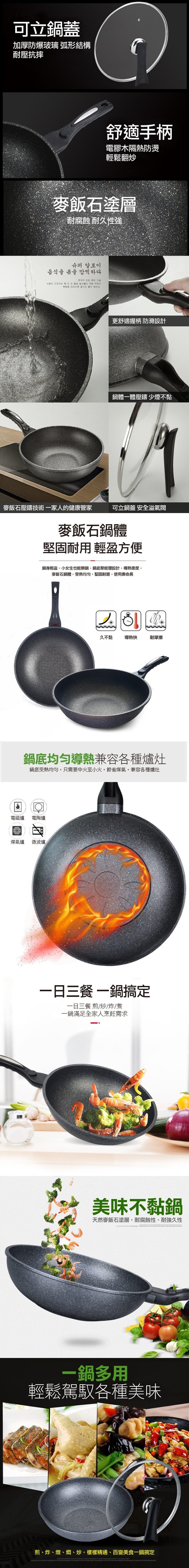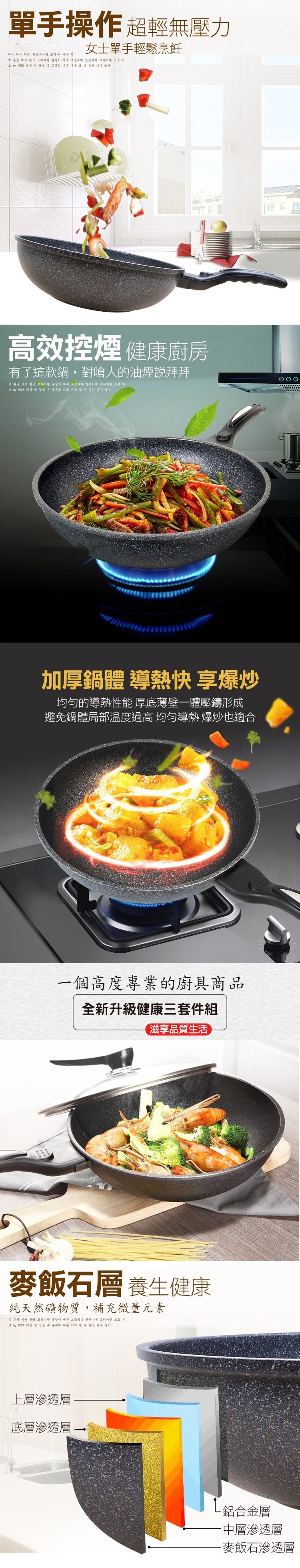 採用多層壓鑄,結構穩固耐承重,聚熱鍋底,熱量傳導快速,均勻受熱,油煙少,大容量鍋身,煎炒炸煮燉皆可,防沾黏設計,輕輕一沖立即乾淨,強化玻璃鍋蓋,鍋蓋可立設計,人體工學手把,握感舒適
