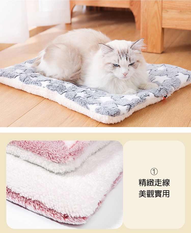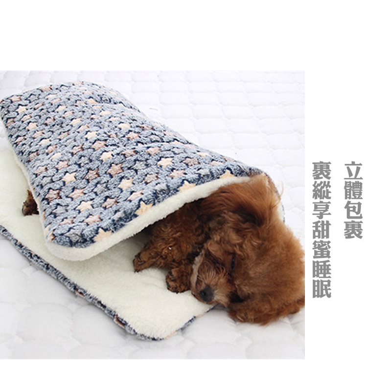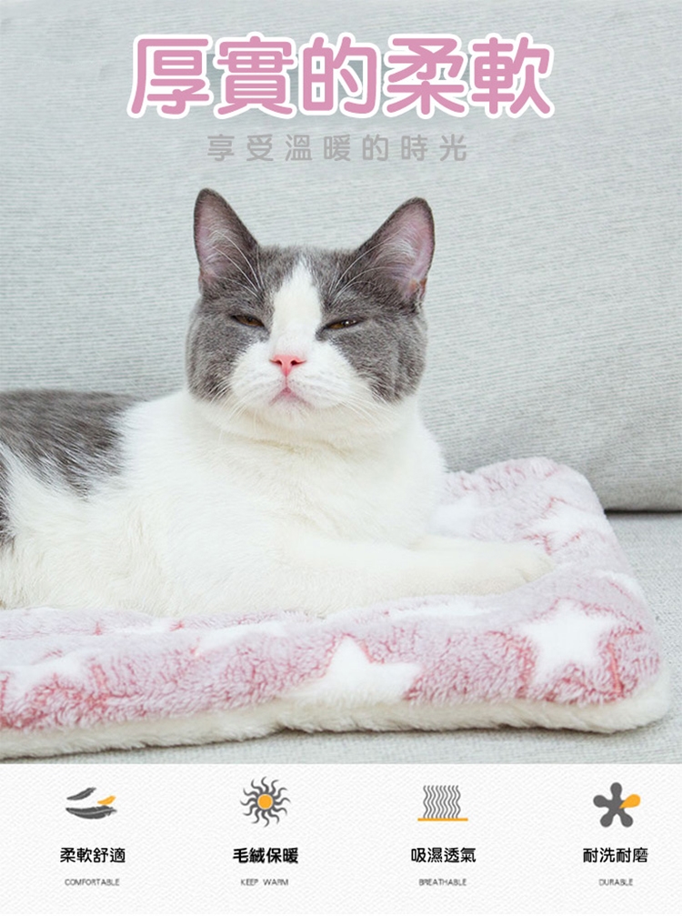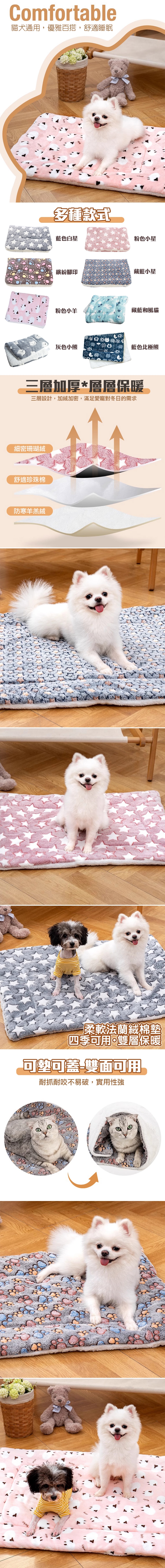 加絨加密、三層加厚、犬貓通用、舒適透氣、雙面材質,一面法蘭絨光滑柔順、一面羊羔絨甜蜜睡眠,細緻加工,可愛俏皮不只深得你心~更深得愛寵的心