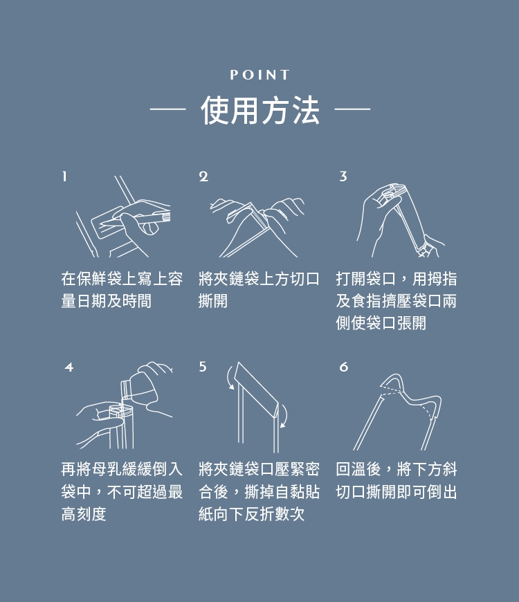 - 袋尾特別雙邊小切口設計,可任選一邊沿虛線撕開,輕鬆方便地將母乳倒入奶瓶,切口較小,乳汁不易灑出。