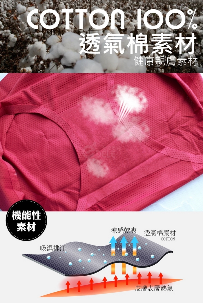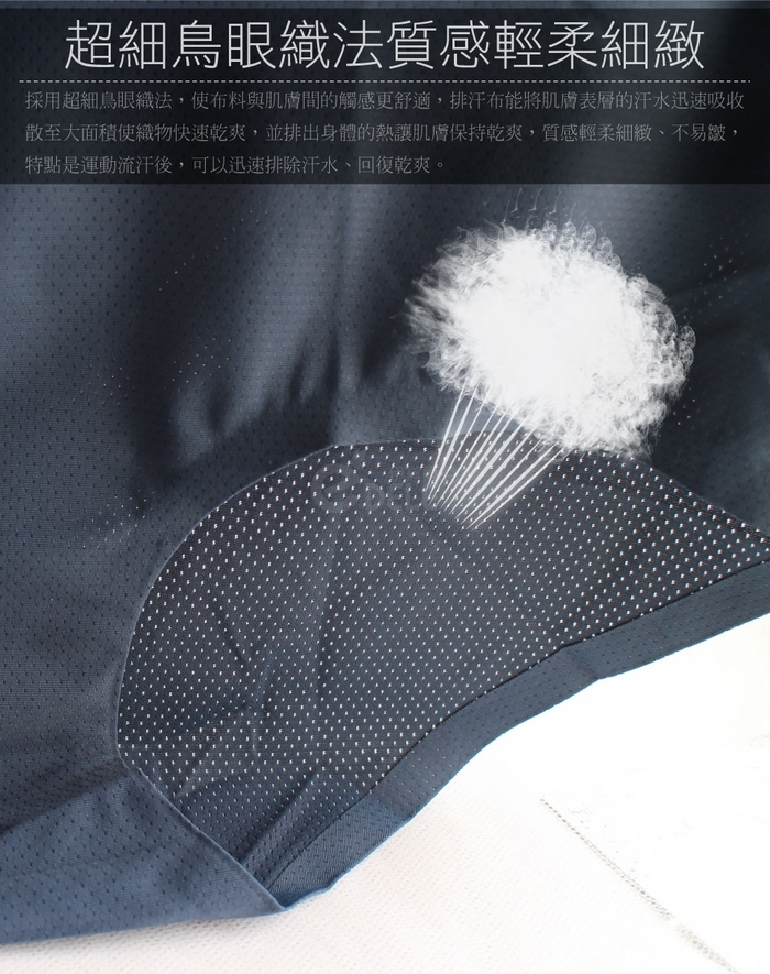 特殊鳥眼織法,布料透氣孔設計,乾爽自在、透氣舒適。