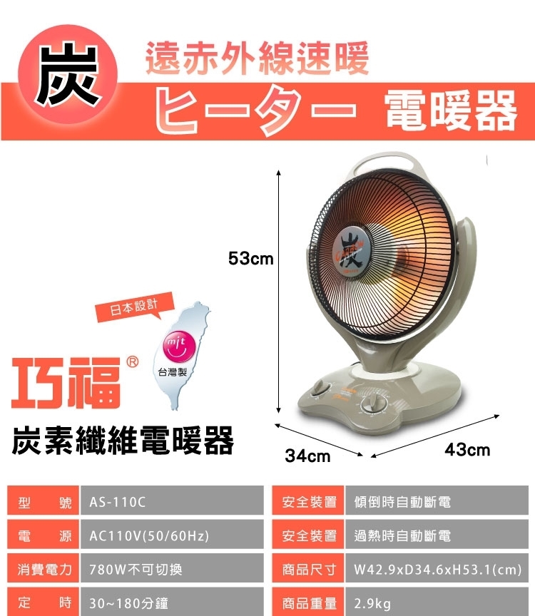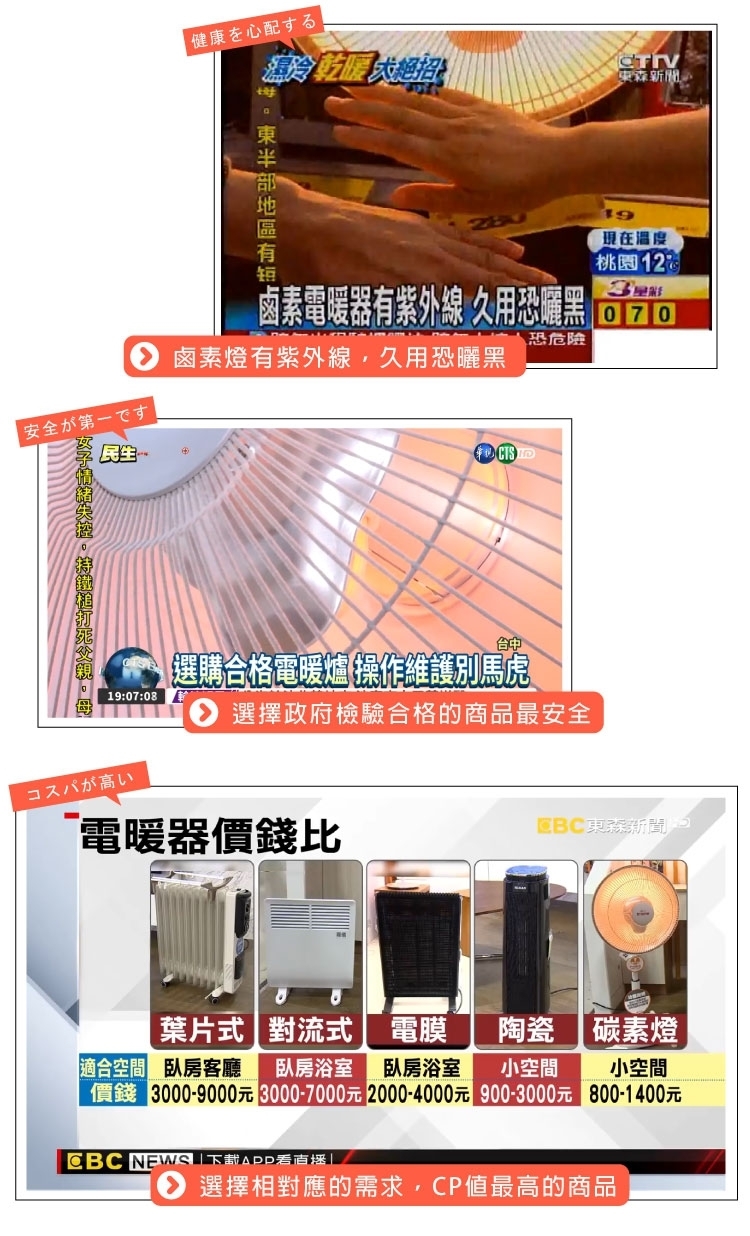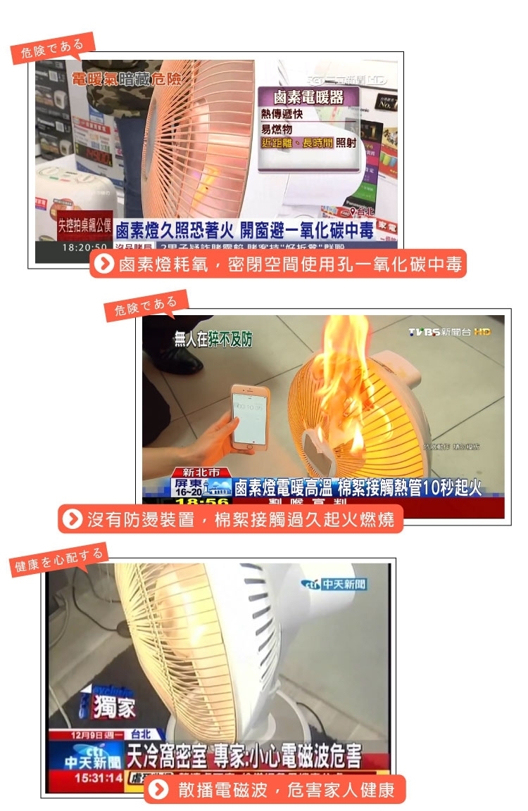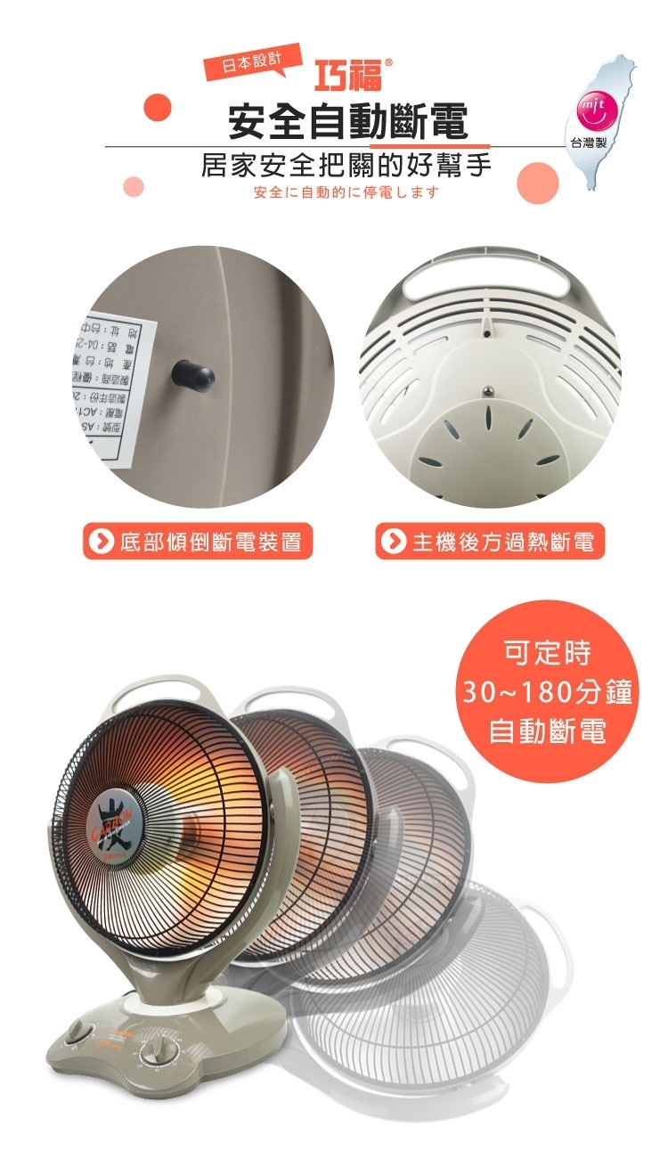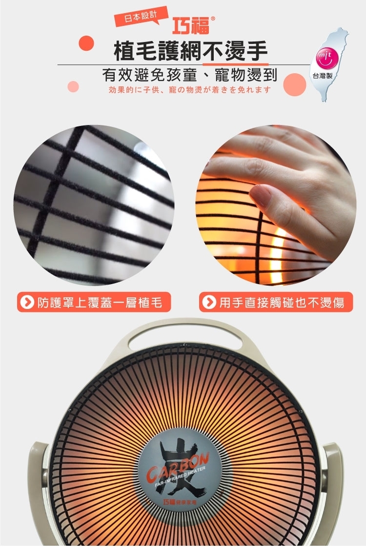 ◎ 保護網上包覆一層不會燙傷肌膚的外皮,傾倒時有斷電的功能,有過熱斷電的溫度保險絲的設計