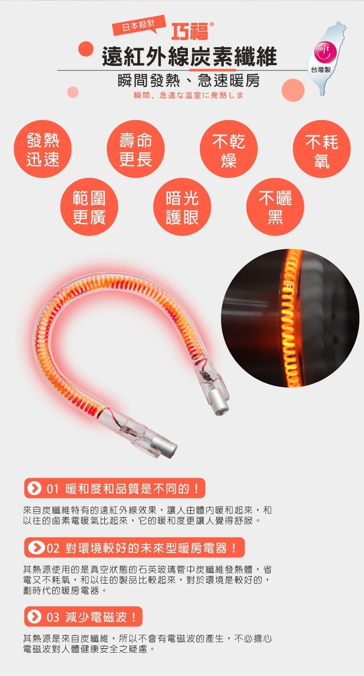 ◎ 使用的是真空狀態的石英玻璃管中的炭纖維發熱體,省電又不耗氧