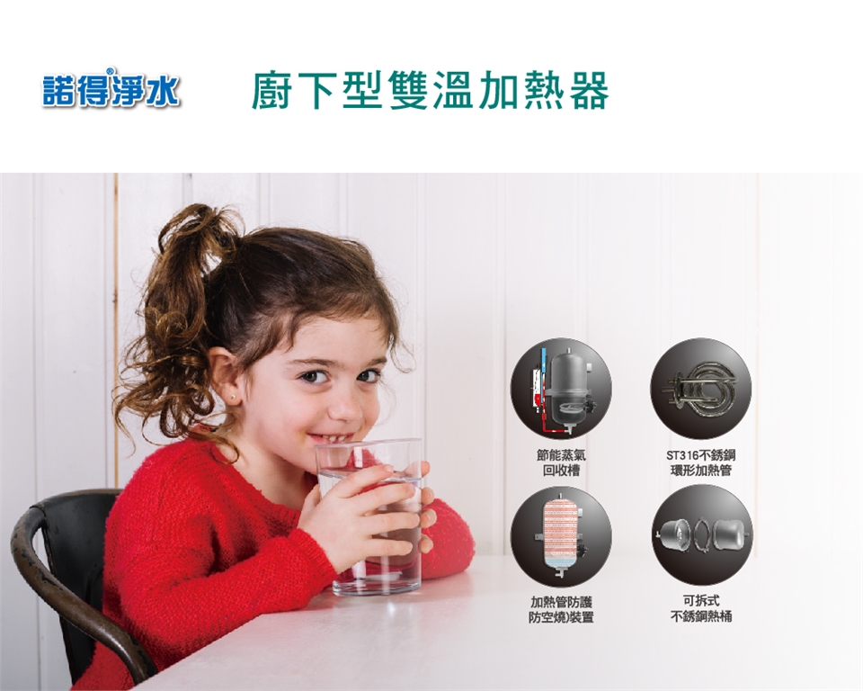 諾得淨水全新開發廚下型雙溫加熱器,簡潔優美大方有很高的熱對比,LED觸控面板顯示熱水溫度,並設計節電、安全鎖、避免燙傷意外發生。,要多少熱水就用多少,更環保、更經濟。一小時能釋放100杯熱水,是普通2.5L水壺所燒水的三倍,非常方便沖牛奶、咖啡、泡茶、及熱水飲用,讓您生活更愜意。