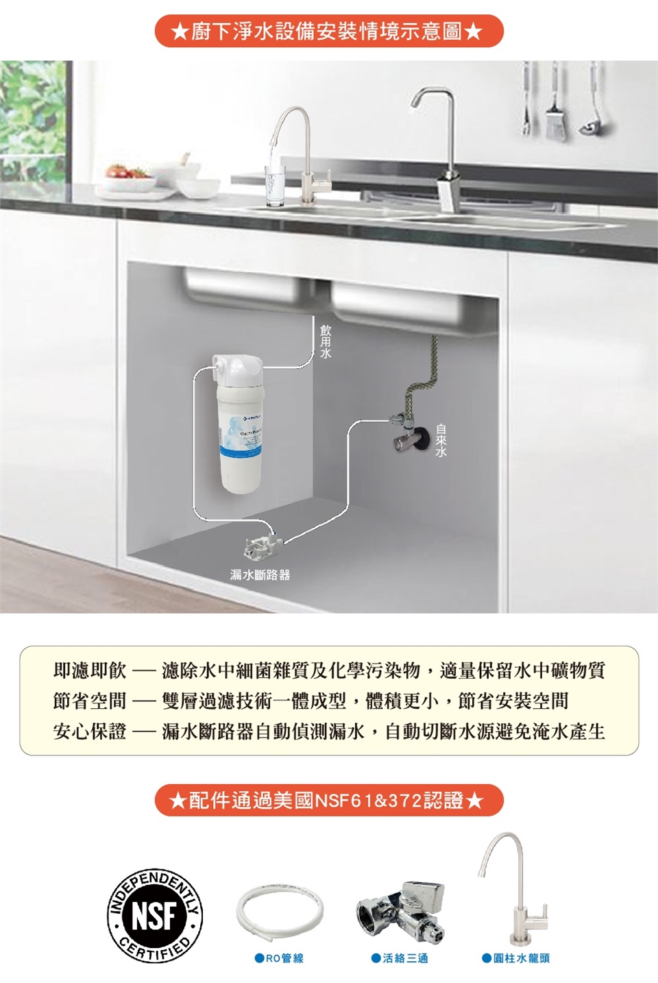 我們堅持採用符合國際NSF61、372標準,無鉛無毒、及耐壓性高的配件,避免重金屬釋出對人體的危害,給您全家喝得安心。