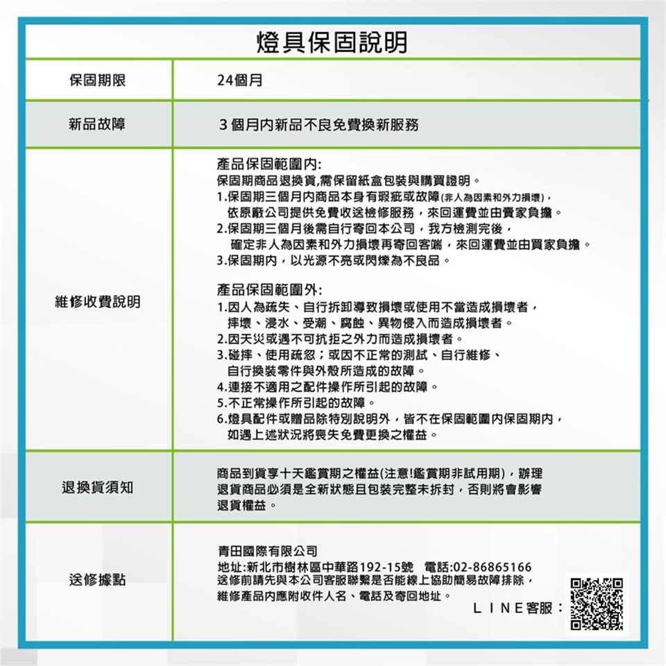 保固服務-『保固期-指非人為損壞,商品以不亮或閃礫為不良品判斷,保固期間客端需自付收送運輸,本公司將檢修或更新提供服務。』保固期前30日非人為損壞若有不亮或閃礫由本公司負擔更換新品。