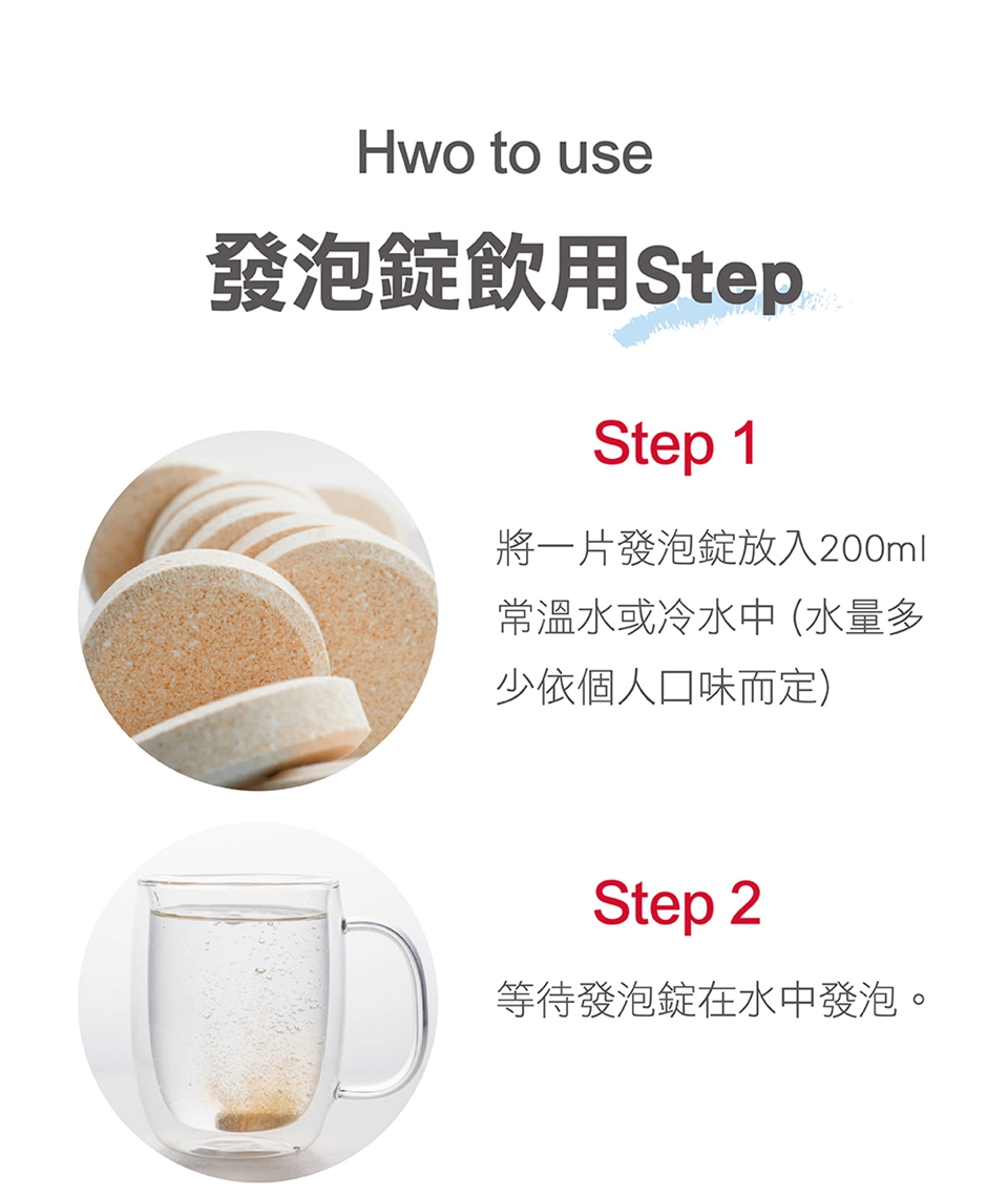 以一片氣泡錠加入200ml冷開水飲用,每日一錠,多食無益