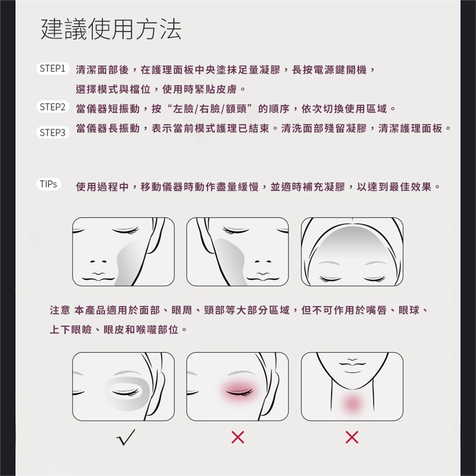 注意事項:1. 臉部有傷口、腫塊、溼疹等肌膚異常情況下請勿使用,建議諮詢醫師。