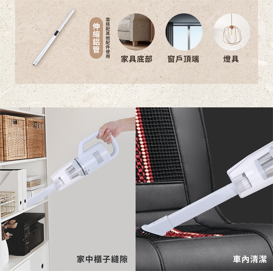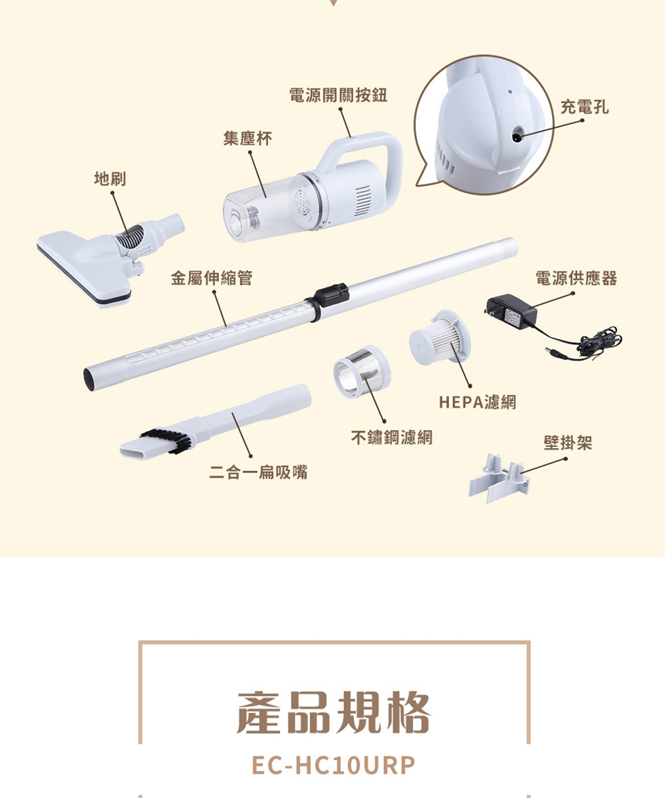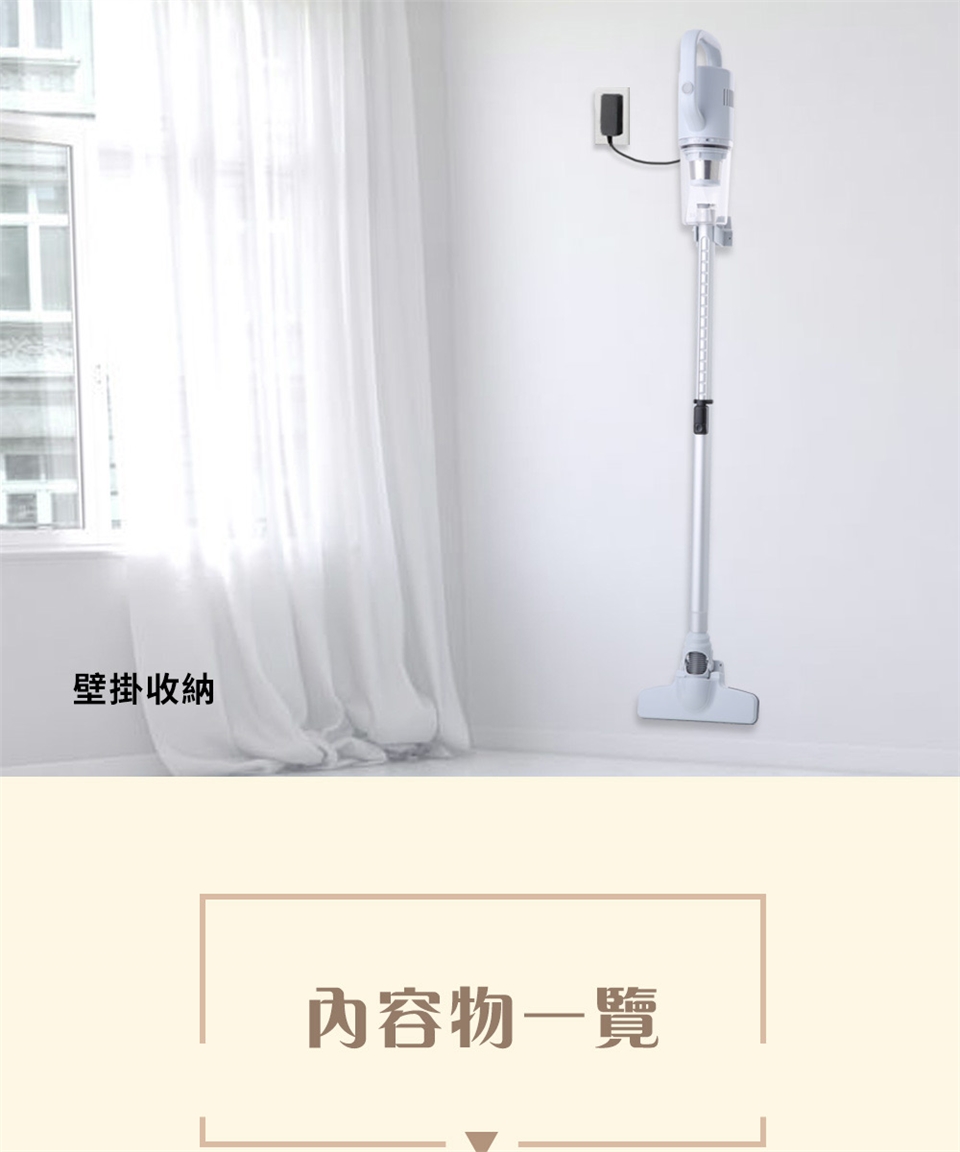 ◆附二合一扁吸嘴、地刷、伸縮鋁管、壁掛架&螺絲組。