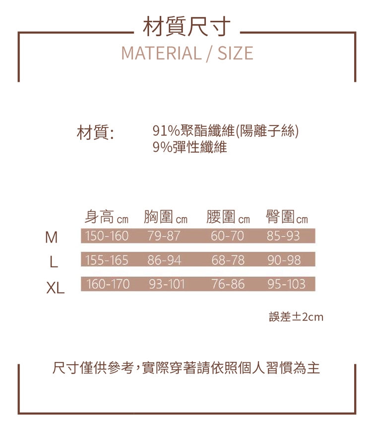 XL:身高160-170胸圍36.6-39.7腰圍29.9-33