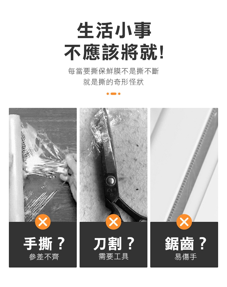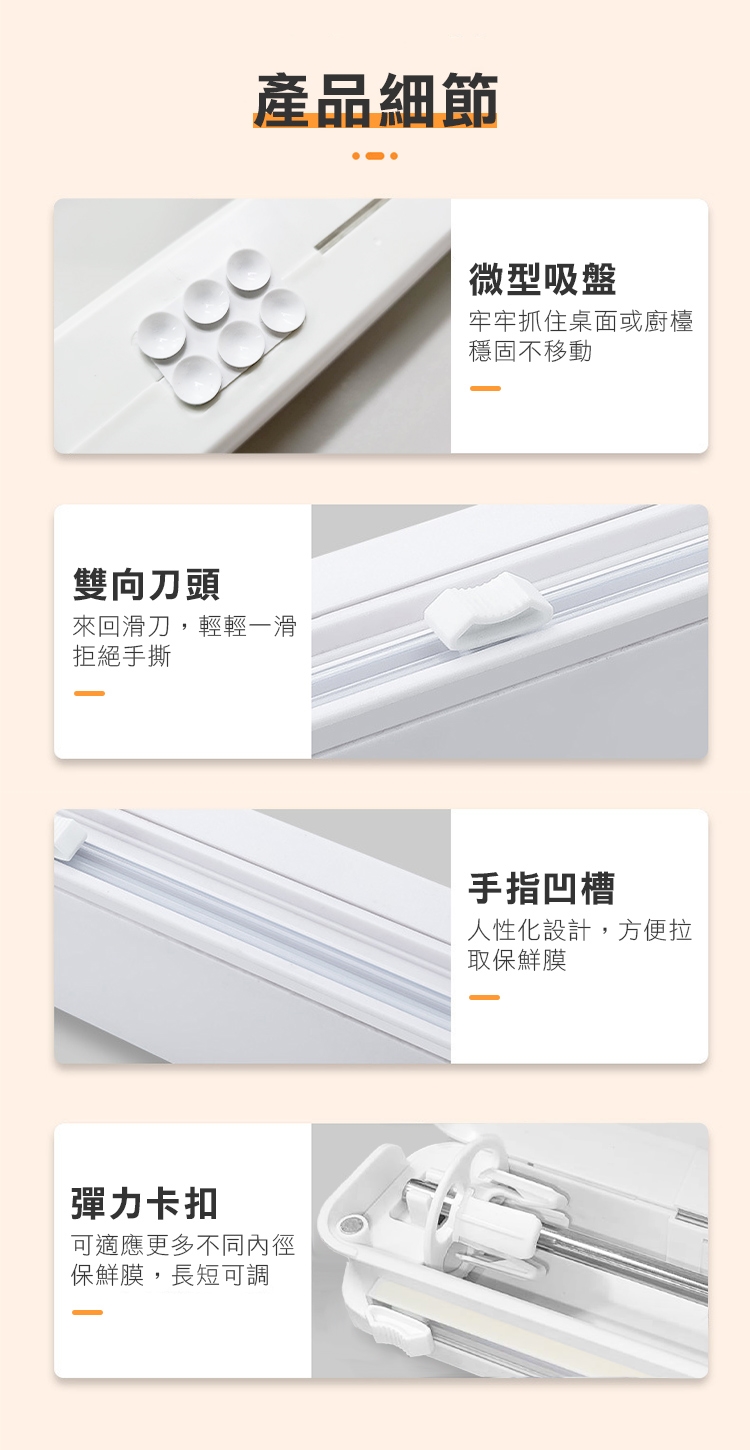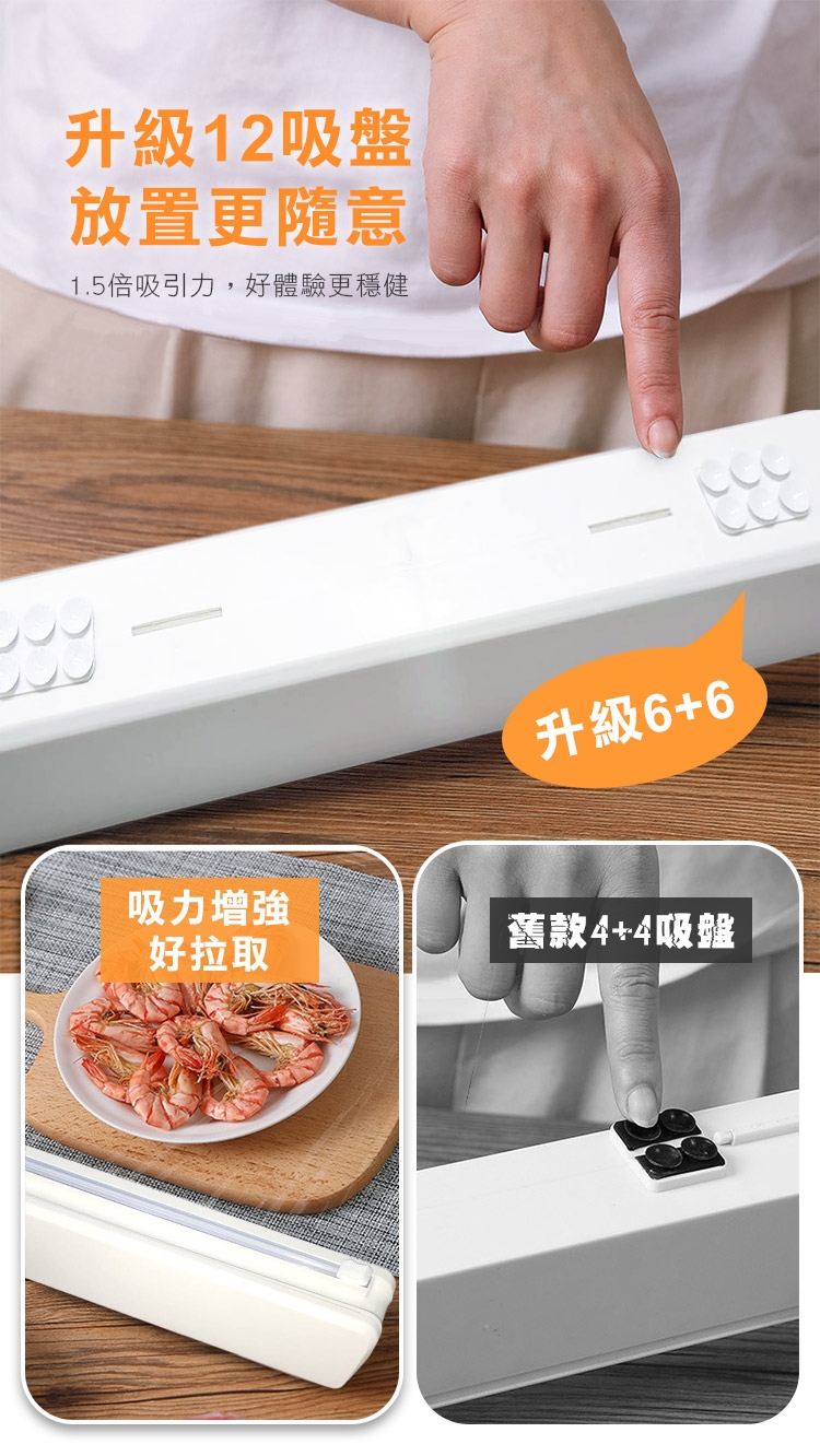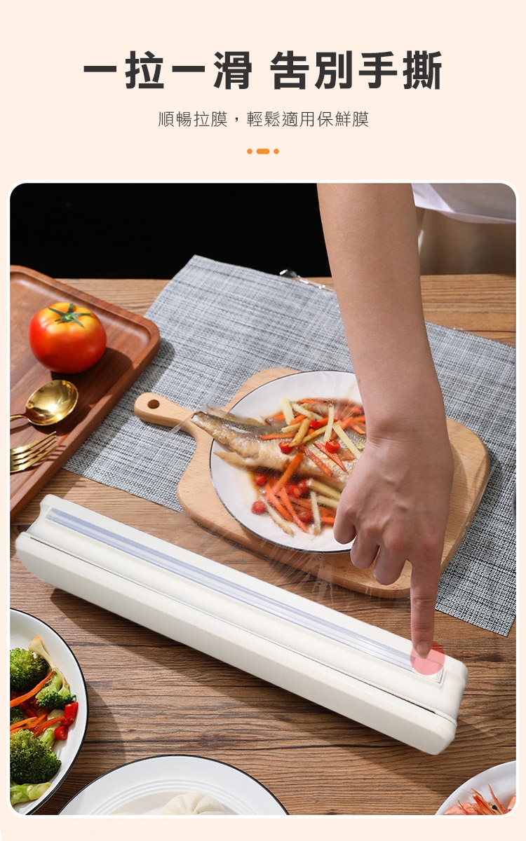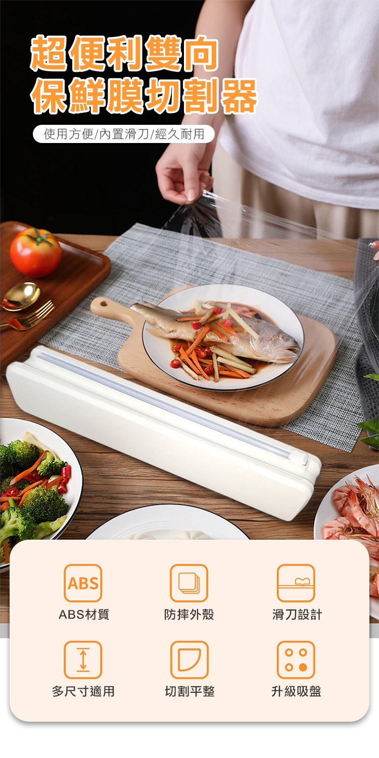 你還在用手撕保鮮膜嗎?不好撕又奇形怪狀?您需要的超便利雙向保鮮膜切割器來了!全新升級6+6微型吸盤,吸力增強放置隨意更好拉取~雙向滑刀告別手撕,1秒切割平滑切邊;手指凹槽設計,讓您輕鬆拉取保鮮膜;時尚美觀外型,提升廚房美好體驗,適用保鮮膜、鋁箔紙等滾筒類用品~