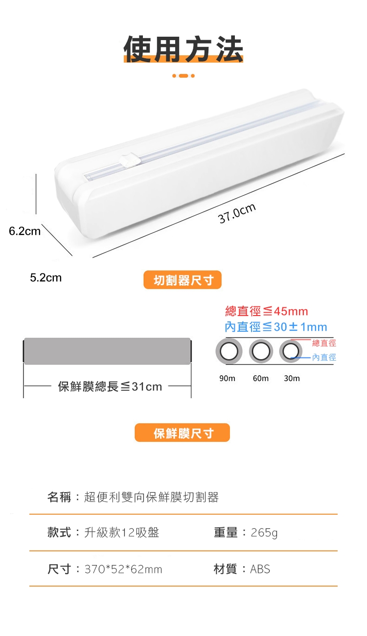 適用尺寸:適用常規保鮮膜管內徑30±2mm,保鮮膜整體厚度45mm寬300mm