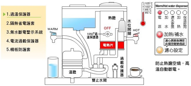 ◎電子式安全保護裝置,無水自動閃爍〝加生水警示燈〞、停止加熱,防止熱膽空燒造成危險