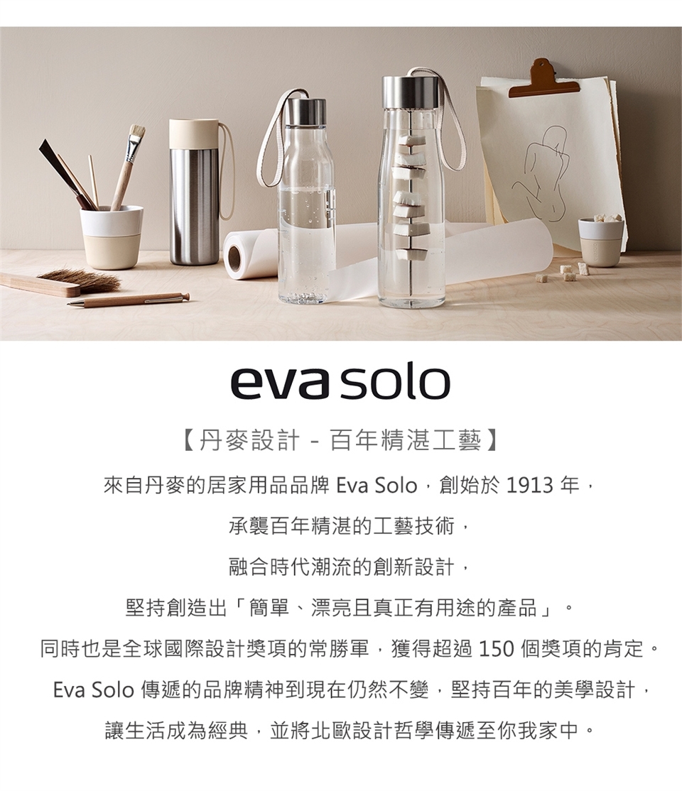 來自丹麥的居家用品品牌 Eva Solo,創始於 1913 年,承襲百年精湛的工藝技術,融合時代潮流的創新設計,堅持創造出「簡單、漂亮且真正有用途的產品」。品牌一直以來的堅持與特色,是讓每件作品在實用功能之外,都富有美麗獨特的外型。Eva Solo 也是全球國際設計獎項的常勝軍,獲得超過 150 個設計獎項的肯定。 Eva Solo 傳遞的品牌精神到現在仍然不變,堅持百年的美學設計,讓生活成為經典,並將北歐設計哲學傳遞至你我家中。