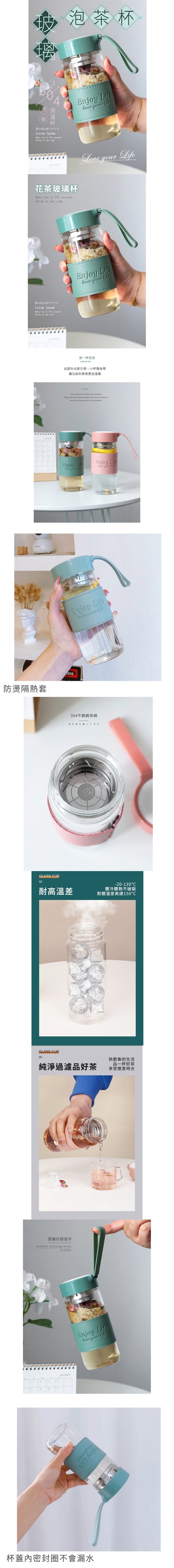 螺紋杯蓋,杯蓋內密封圈防漏水,內附304不鏽鋼茶隔,純淨過濾不會有茶葉渣,採用耐熱高硼硅玻璃,耐高溫差,驟冷驟熱不破裂,耐酸鹼適合各式飲品,硅膠提繩及防燙隔熱杯套,戶外旅行隨身攜帶更方便