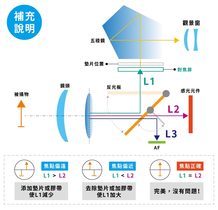○須將圖示的L1跟L2相等,這樣焦點才會正確
