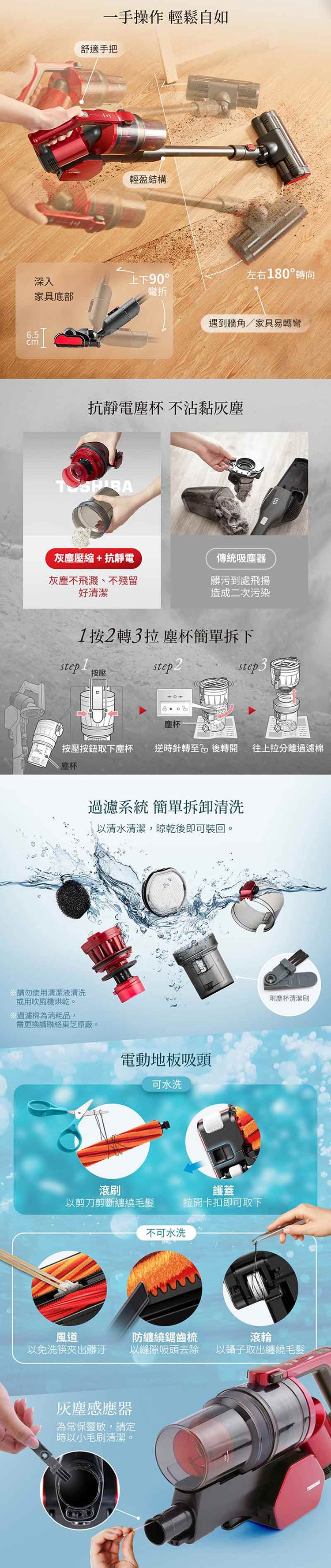 ◆灰塵壓縮技術搭配抗靜電材質塵杯,灰塵不飛濺、不殘留,好清潔。
