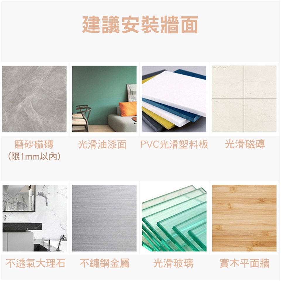 適用牆面:玻璃面、平面光滑、凹凸1mm內牆面、磁磚平面..等