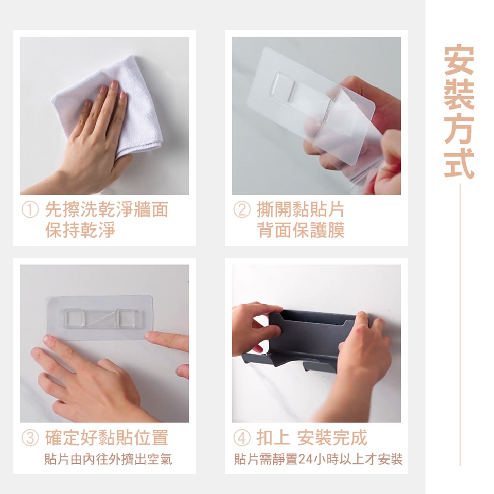 4.安裝完 成:將貼 片靜置約24小時以上再掛上收納架即可使用