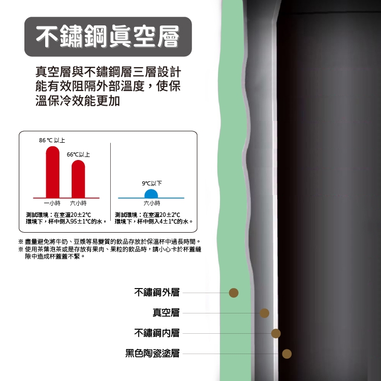 4.請勿長時間裝置碳酸飲料.牛奶.果汁.豆漿等易腐壞飲品,因可能會內壓上升無法開啟或飲品腐壞。