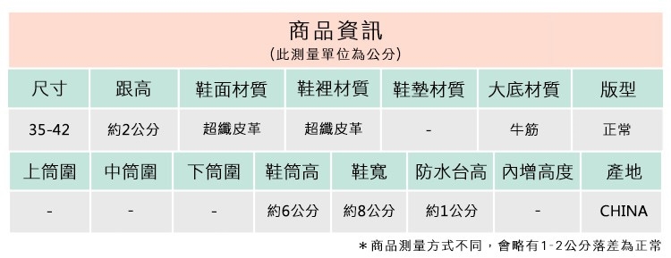 2.鞋類商品依功能及用途之不同,鞋底各有其止滑係數之個別不同,使用鞋類商品請用於正常平坦之路面,非雨鞋或雨靴類商品,請避免穿著於下雨濕滑路面上行走。