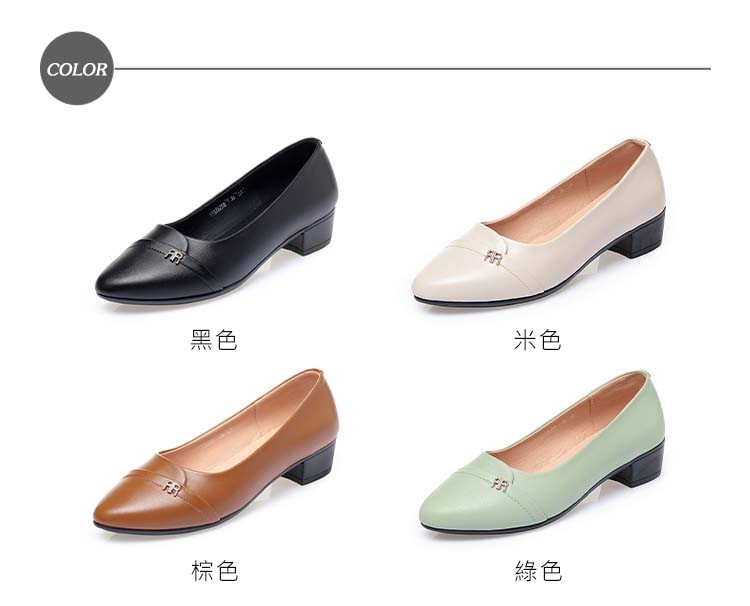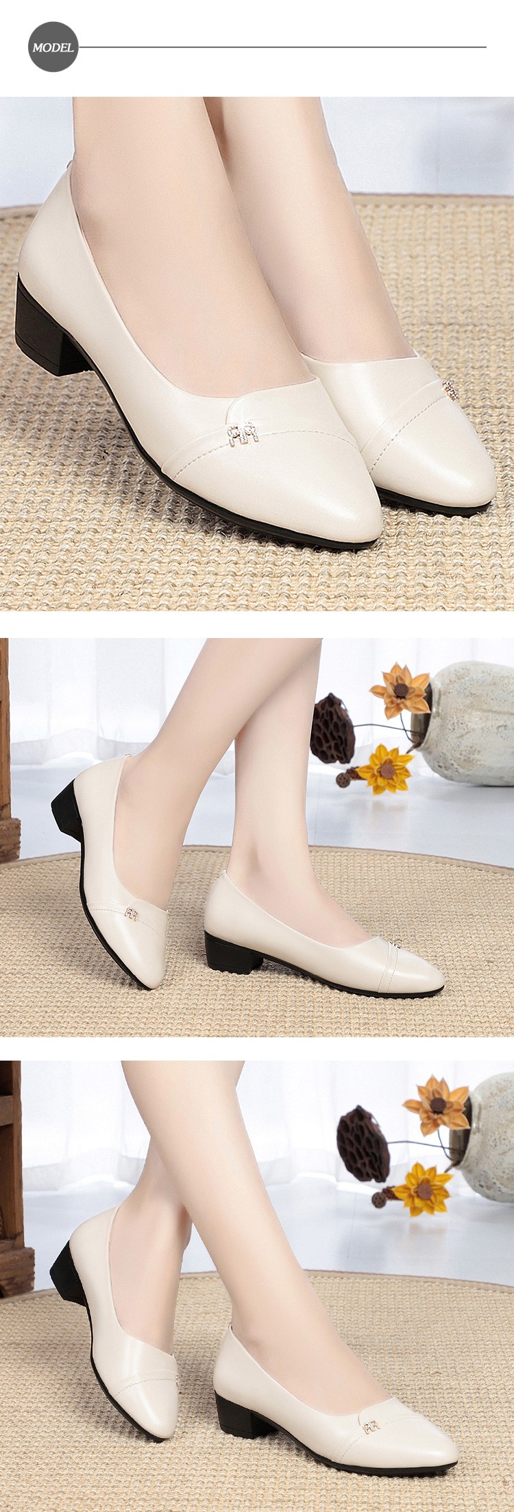 【MOM】跟鞋 粗跟鞋 /真皮小尖頭美鑽飾件時尚粗跟鞋 米