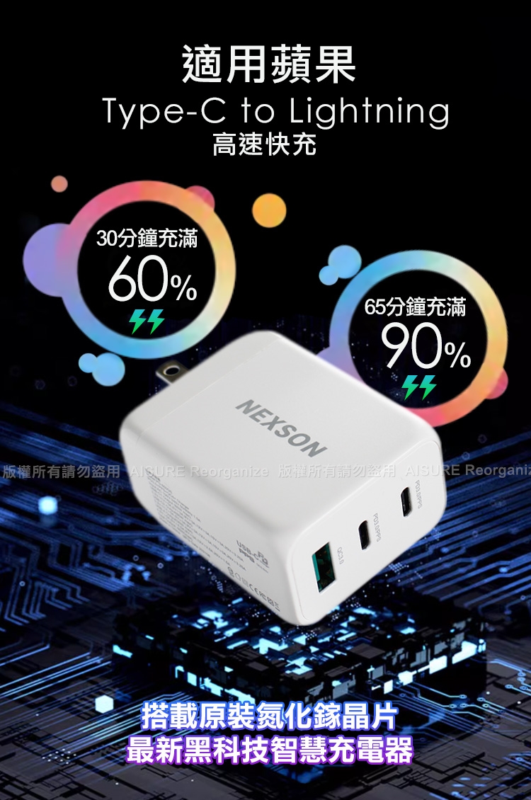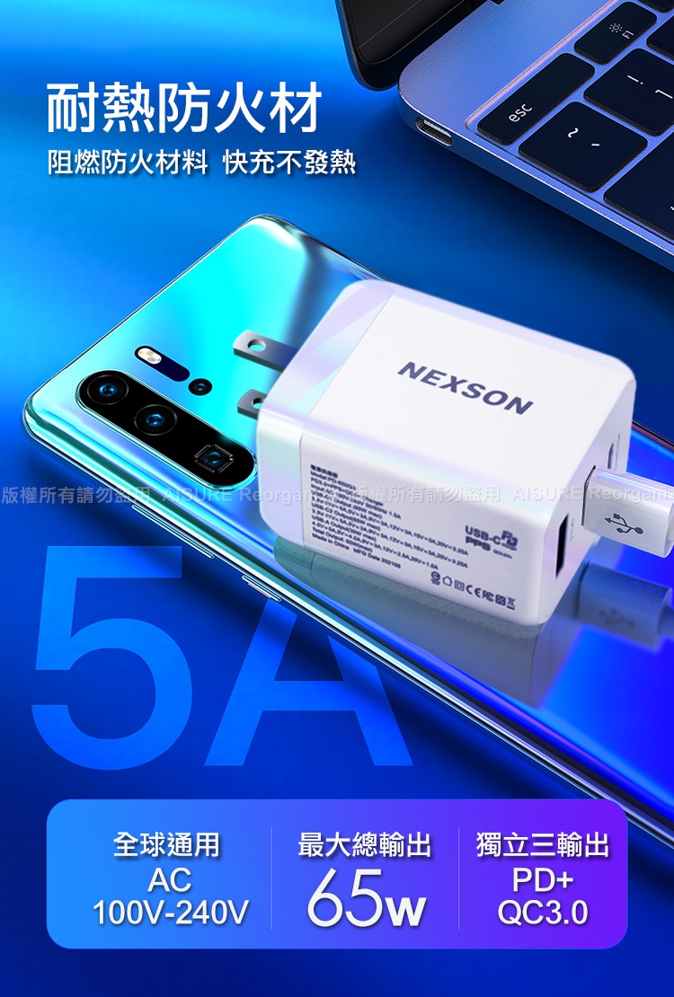 NEXSON GaN氮化鎵65W PD3.0+QC3.0 筆電 平板手機共用 2C1A 快充充電器-白色 (台灣公司貨)