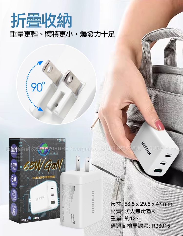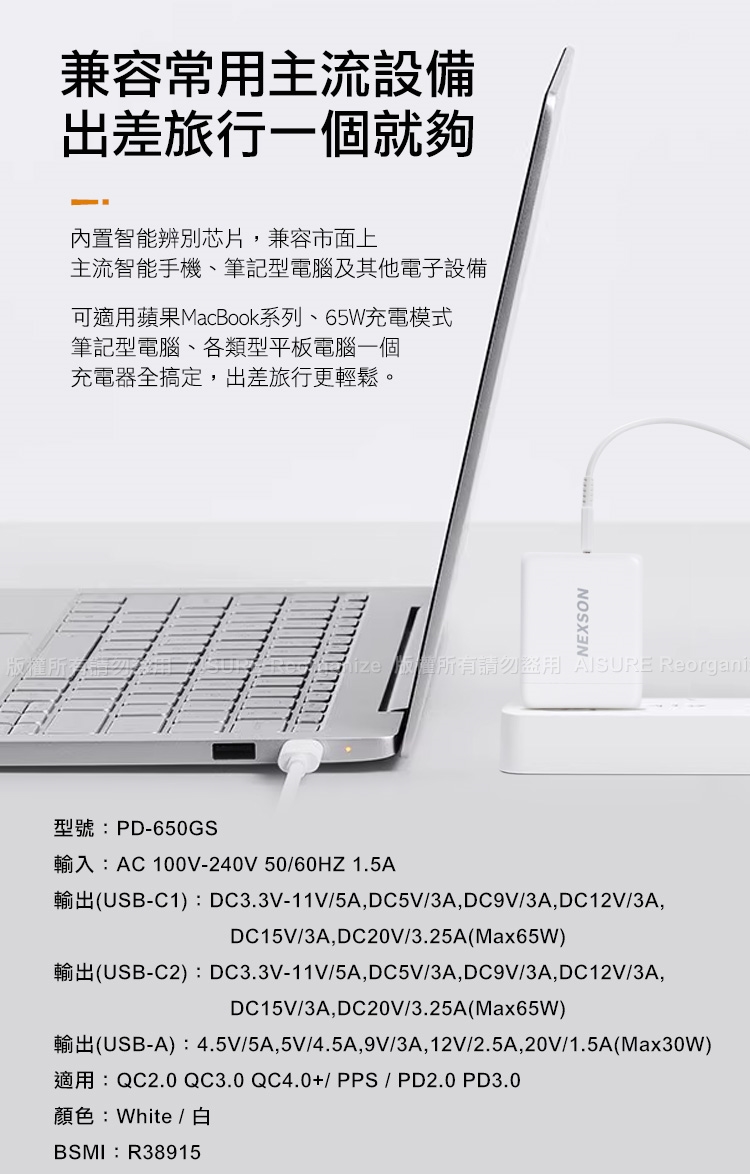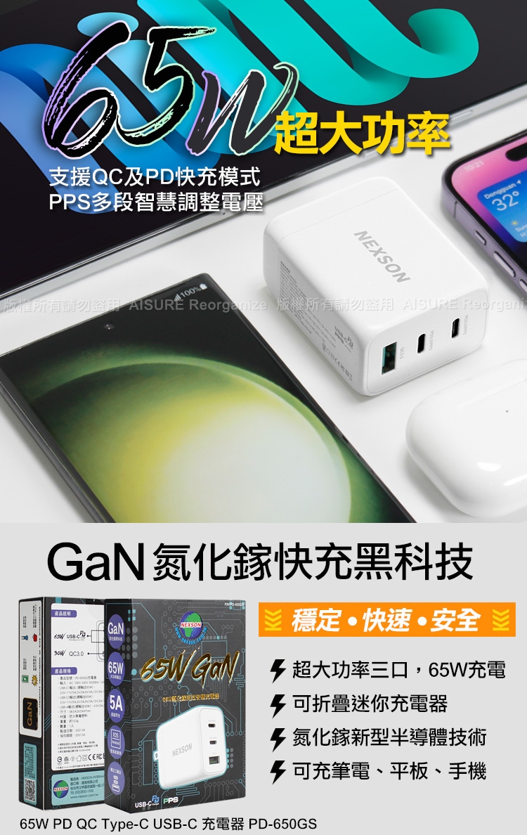 - 而「NEXSON 65W氮化鎵快充電源供應器PDQC3.0」,使用雙孔Type-C分流輸出,雙充也不搶電~~