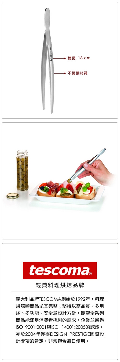 本商品一件入,適用洗碗機。料理中精緻的盤飾以及西點上面的裝飾,往往會對精心烹製的料理有畫龍點睛的效果,但越精細的裝飾越考驗手指的靈巧度,推薦您使用這款小鑷夾;略彎的弧度好抓拿,可夾取罐裝醃漬品等各式食材,衛生不沾手,靈活度更高,是您在擺盤裝飾時不可或缺的好幫手。