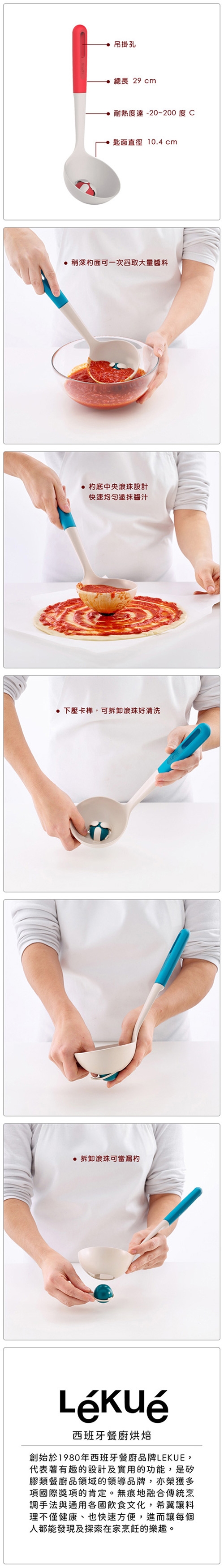 本商品一件入。製作大份量的披薩時,除了先桿製大片的麵皮外,後續塗抹醬料、放置配料都需花些時間,推薦您此款漏杓。以人體工學設計的握柄,讓您拿握舒適又好施力;稍深的杓面可一次舀取大量醬料,藉由杓底中央的滾珠設計,快速在麵皮上以畫圓的方式均勻塗抹醬汁。使用完畢可由杓內下壓卡榫,即可輕鬆拆卸掉滾珠與小底盤,清洗方便更衛生;舀取、塗抹醬料一次完成,讓您烘焙料理時更有效率。可吊掛收納不佔空間。其次,滾珠拆卸後,杓中央凸起的三根固定軸仍將存在,可當作濾杓使用,舀取燉湯內的燉煮物。