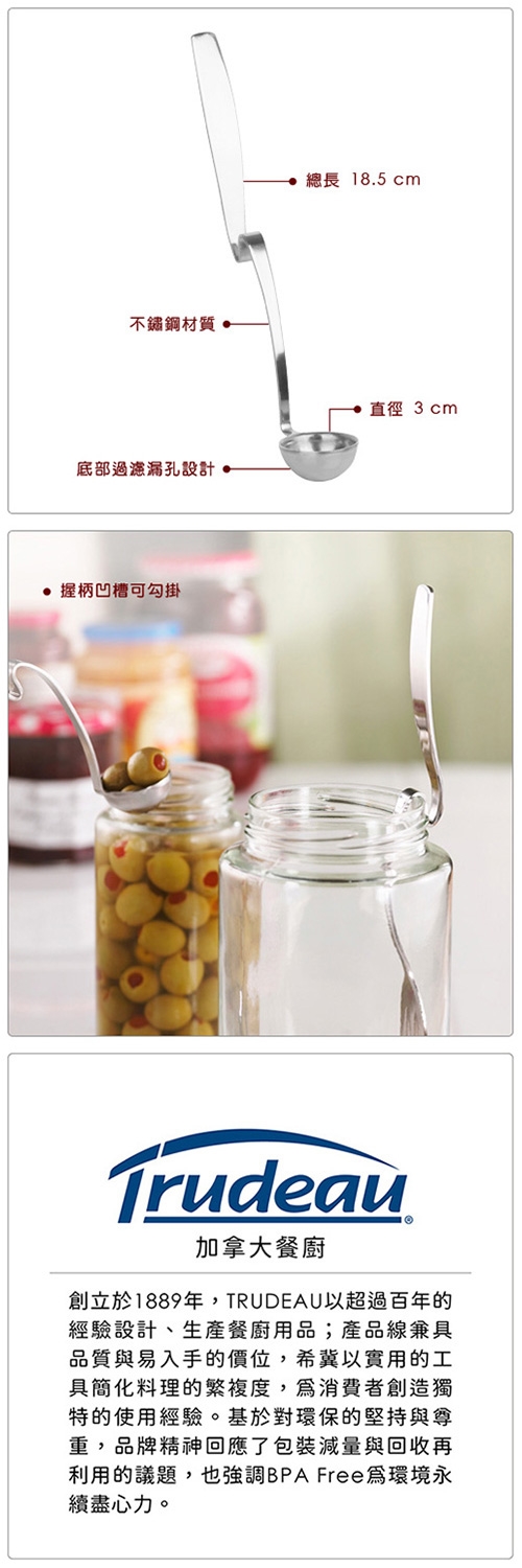 本商品一件入、適用洗碗機。家中的瓶瓶罐罐有大有小卻常常找不到適合的舀匙。此款濾匙的長柄設計不僅可以深入窄罐,輕鬆舀起,更不會弄得滿手黏膩;握柄的凹槽可直接將濾匙掛在瓶罐邊緣,方便不佔位;適用醃漬櫻桃、橄欖粒等,可過濾不需要的湯汁。
