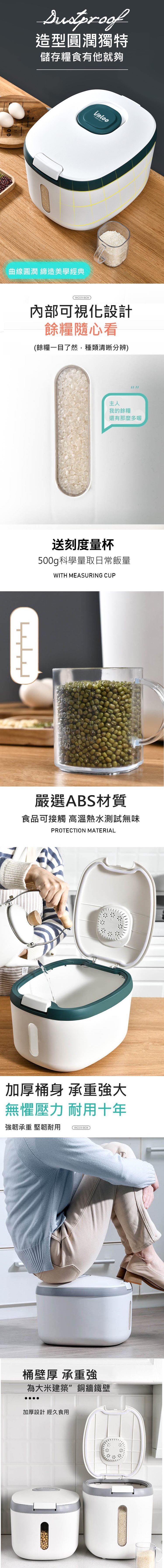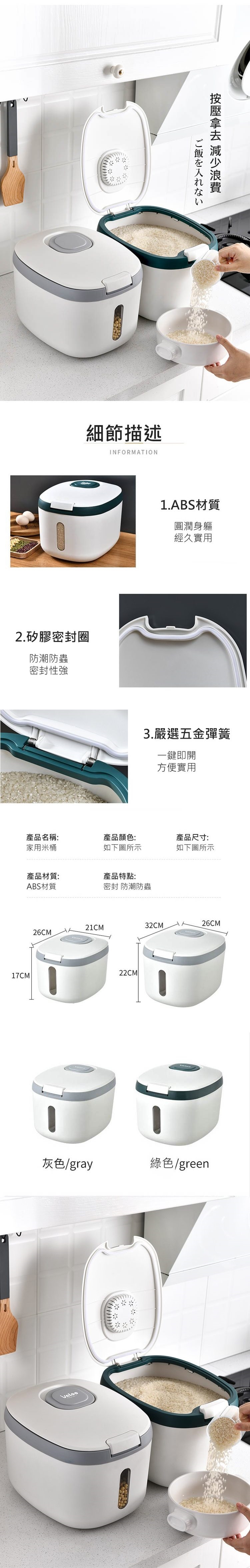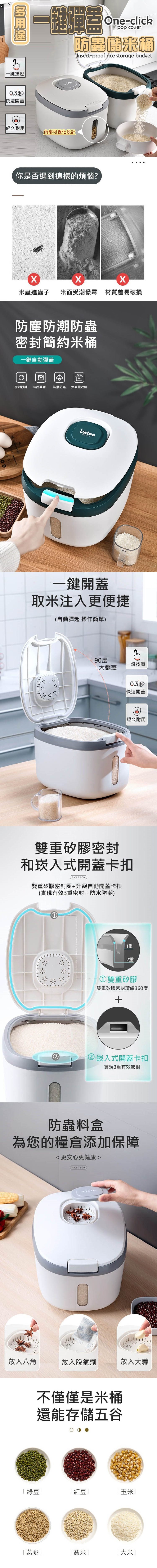 ABS材質,圓潤身軀,一鍵彈蓋秒開蓋,防蟲防潮設計,加厚桶身,厚實耐用,密封膠圈保存效果佳,上蓋防蟲料盒,防塵避蟲,可視設計,用量一目了然,不只儲米,五穀雜糧皆可