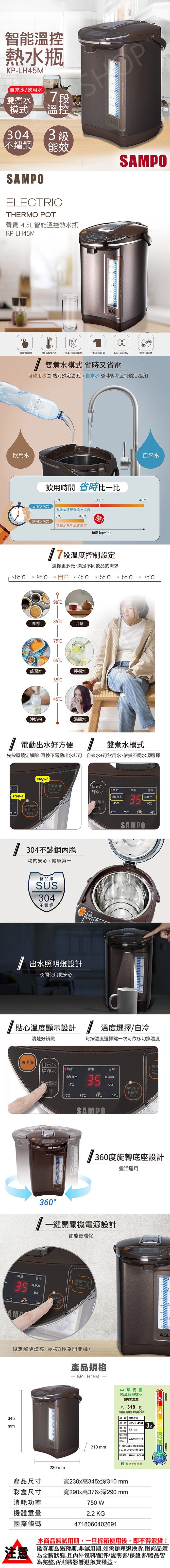 【聲寶SAMPO】4.5L智能溫控熱水瓶 KP-LH45M