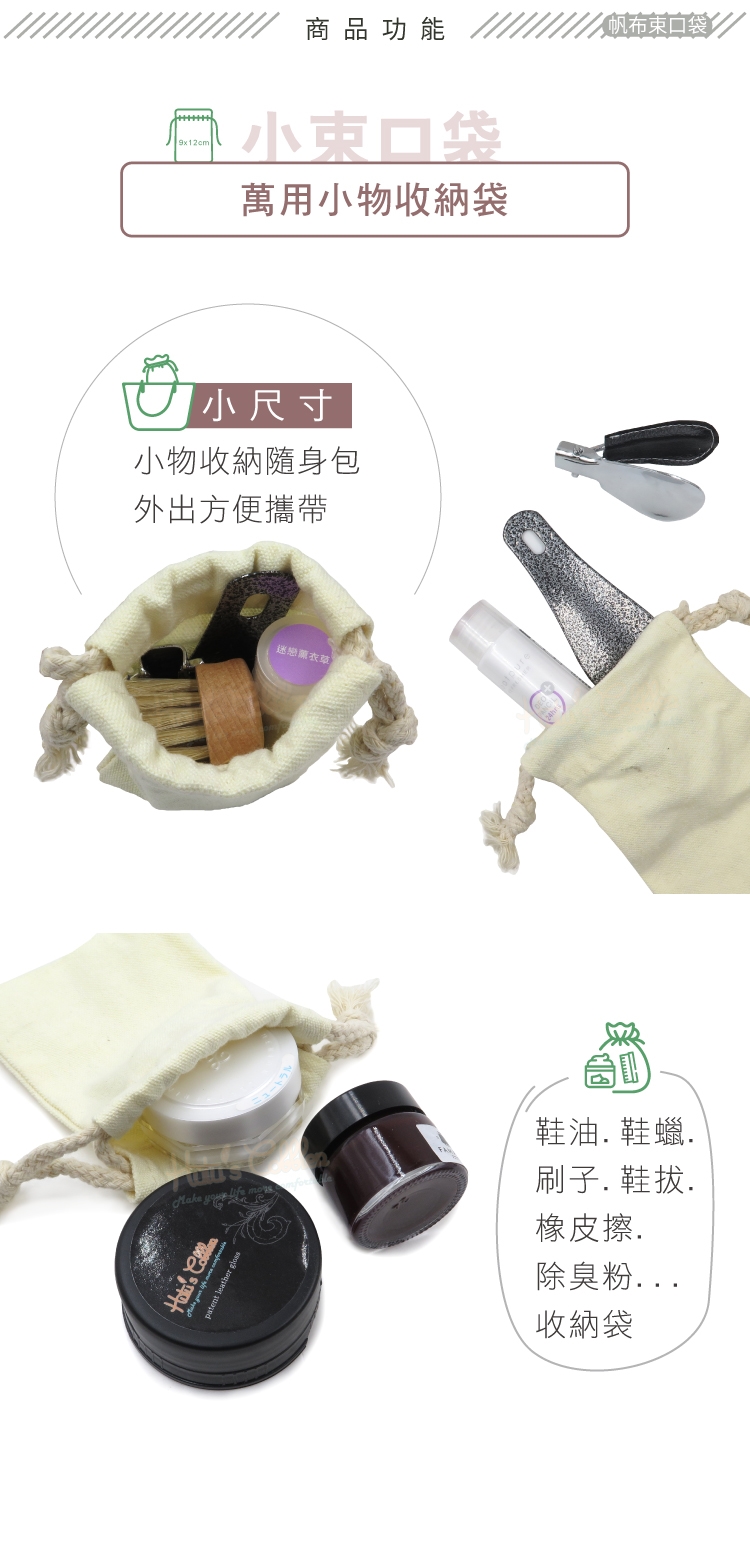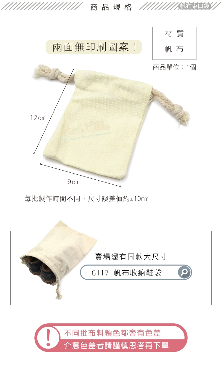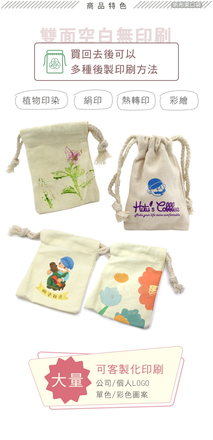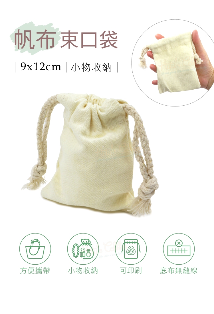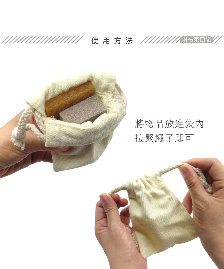 素雅帆布材質;抽繩束口開袋;繩子雙邊打結;