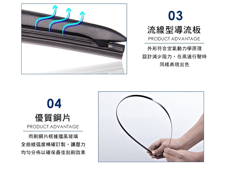 ◆雨刷鋼片根據擋風玻璃全曲線弧度精確訂製,讓壓力均勻分佈以確保最佳刮刷效果。