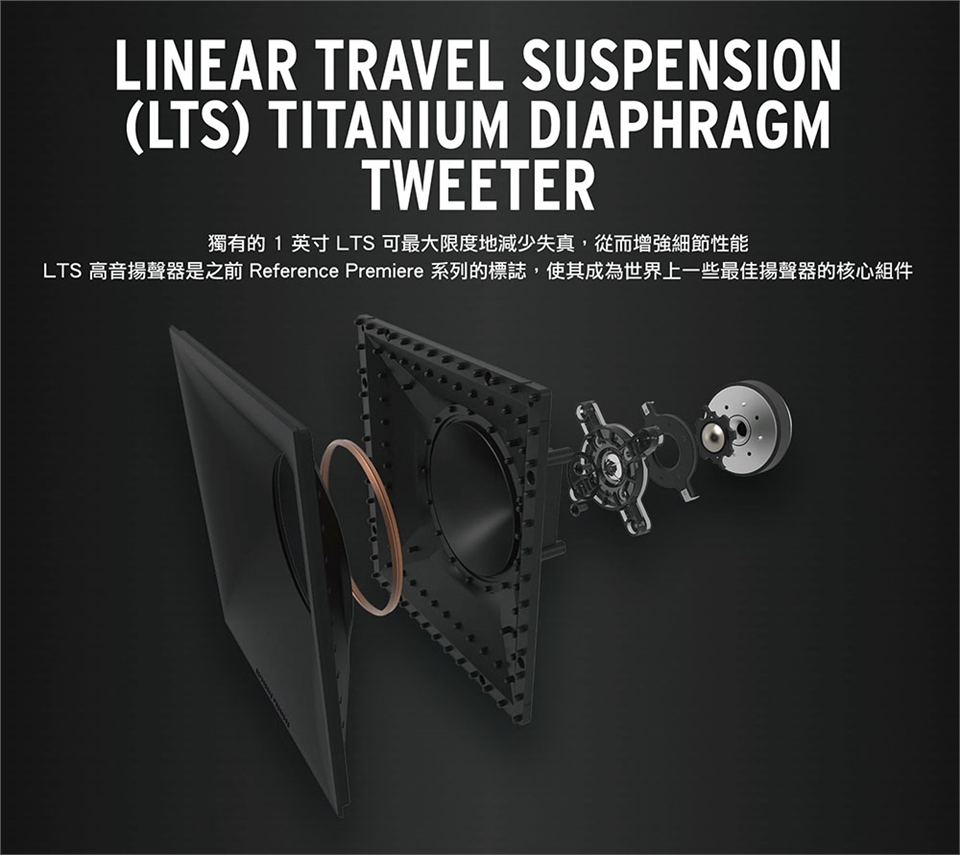 高音單體: 1" 鈦合金 LTS 高音單體搭配專利Tractrix® 號角