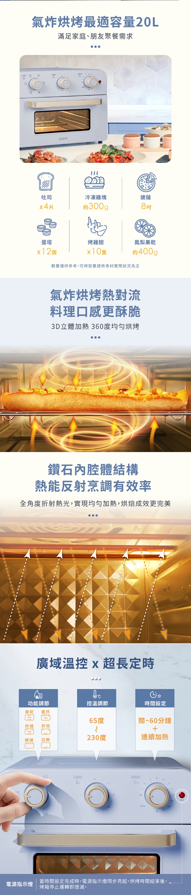 ◆65~230°C溫度調節搭配60分鐘&連續定時,滿足不同烘焙需求。