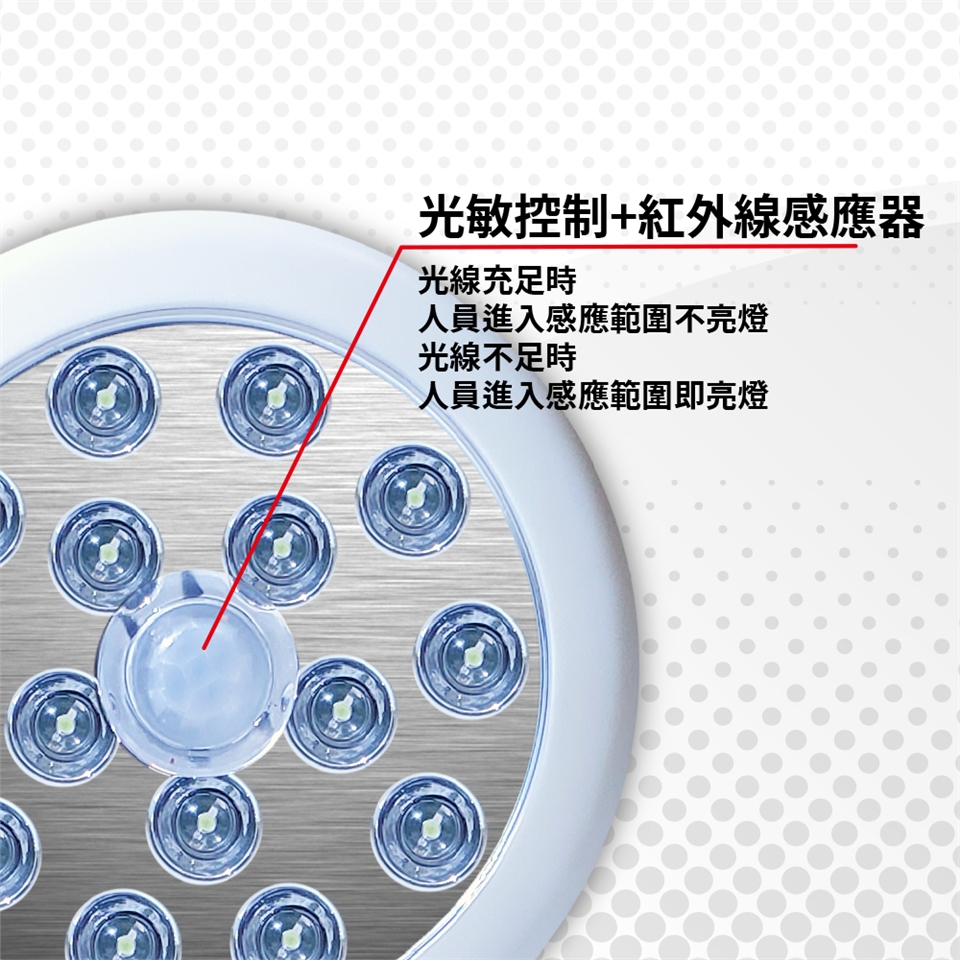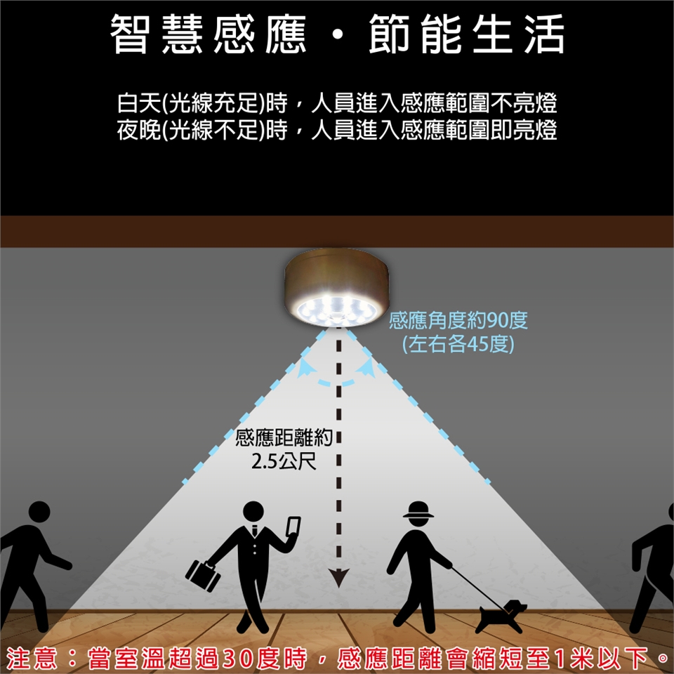 - 夜間或光線昏暗時隨著感應亮燈,白天或光線充足時則自動關閉不動作,節能省電。