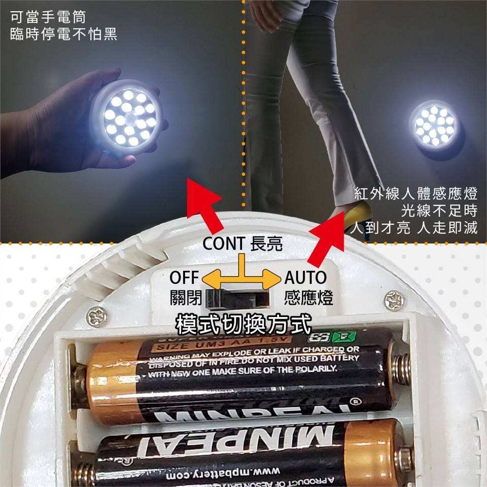 - 在自動AUTO感應模式時,具有人體感應、光控功能。