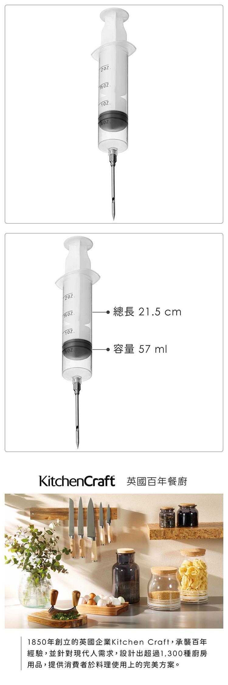 想要烘烤出多汁的烤雞,或是杯子蛋糕甜餡,推薦您這款入味器;如針筒狀前端有細窄針頭 (不鏽鋼針頭旋轉套入),首先直接以針頭吸取高湯、醬汁,再以鋼針插入肉品內,推壓柄將醬汁注入即可。適合桶仔雞、甕仔雞料理,於雞肉注入滷汁、鹽水或醃製醬料,烤後雞汁鮮美入味。糕點類如瑪芬蛋糕、甜甜圈,可填入果醬、奶油增添口感。
