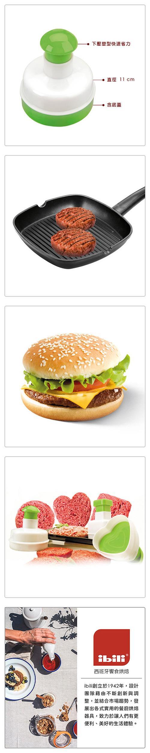 本商品一件入 (含底蓋)、適用洗碗機。Clasica 系列,經典設計搭配優雅線條,提供實用與美觀兼具的舒適使用體驗。香噴噴又柔軟的漢堡肉是大人小孩的最愛,想要兼顧美味與健康,那就自己動手做吧;有了漢堡肉製造器,可控制自己偏愛的肥瘦比例,更可加入洋蔥、紅蘿蔔,為不愛吃蔬菜的小朋友補充營養。圖章式擠壓設計 (壓柄內設有彈簧),輕鬆省力塑型容易,適合漢堡肉、可樂餅、煎餅或飯糰等定型使用。使用時將絞肉填入底蓋,下壓彈簧式擠壓器,多餘的肉餡將由側邊溢出;壓緊後即可煎出飽滿厚實的漢堡肉排囉。