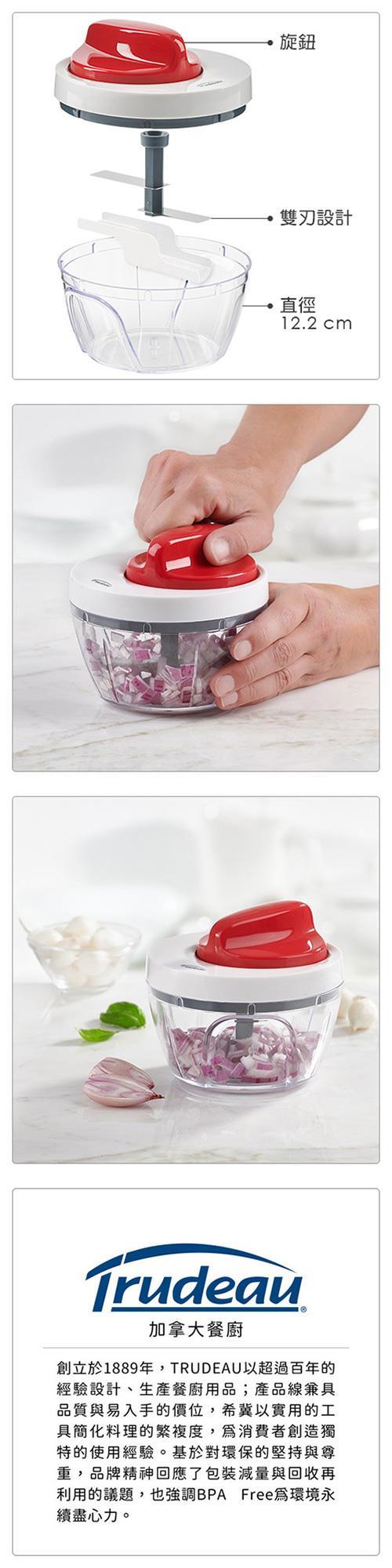 料理時經常需要處理大蒜、辣椒、洋蔥等辛香食材,推薦您這款切碎器;將去皮後的大蒜、切片後的洋蔥放入底罐中,再將切碎器穩固裝上並旋轉,即可輕鬆切碎食材;亦適合切碎蘑菇、青椒、小黃瓜等,是餐廚中的推薦單品。