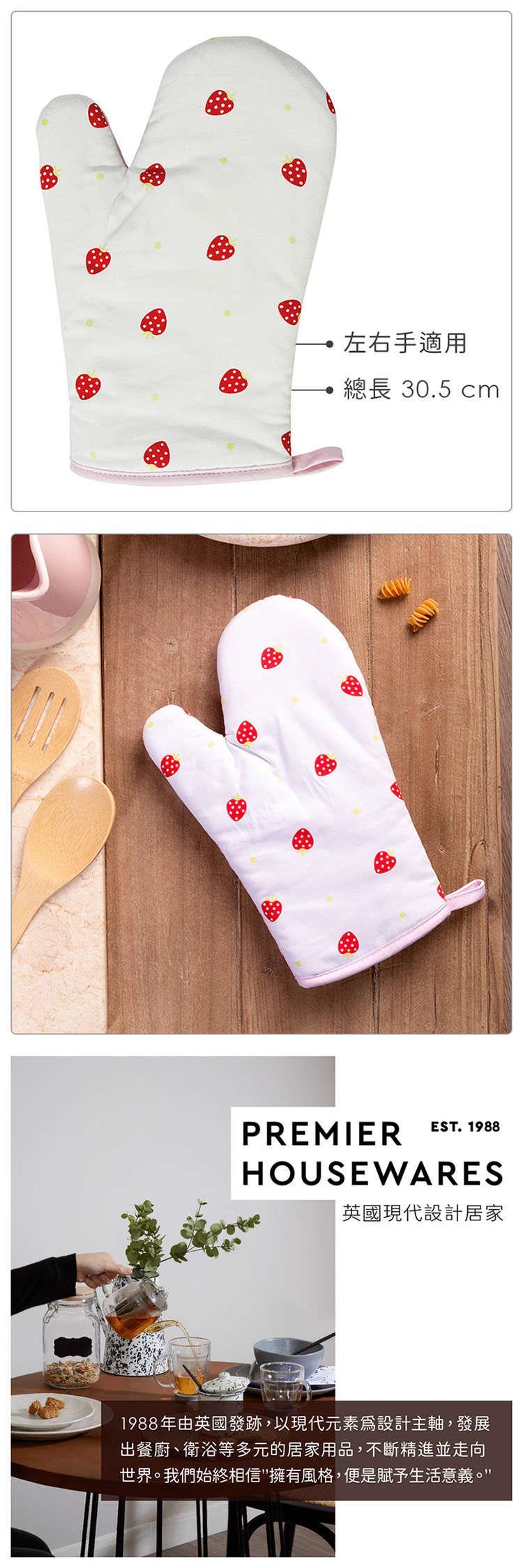 端取剛出爐的烤雞、點心或提取蒸籃等,需使用隔熱手套來保護手部以免燙傷。推薦您此款隔熱手套,以可愛草莓為主題,為您的日常烘焙、餐廚增添樂趣。純棉面料柔軟溫和,搭配厚實內裡可有效隔熱;吊掛收納設計幫助節省餐廚空間,是您料理、烘焙時的好幫手。