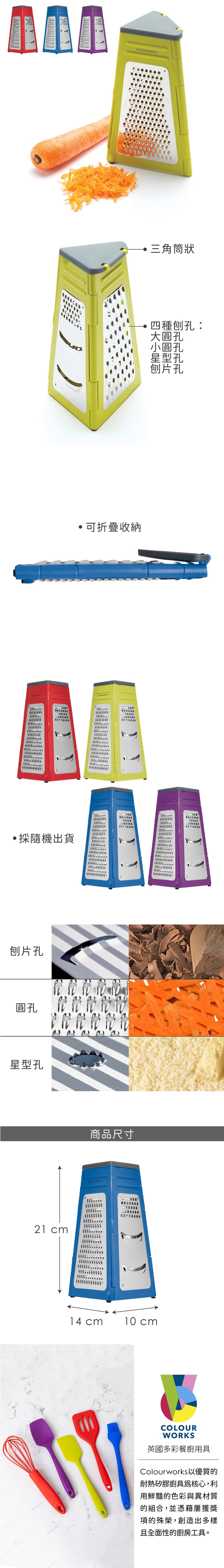 處理起司乾酪、杏仁核桃;或是黃瓜、檸檬、洋蔥、大蒜等各式蔬果佐料時,總少不了削切工具的幫忙。推薦您此款筒型刨刀,4 in 1 設計能將各式食材刨切成適當大小。底部具有止滑設計,方便施力好操作;可折疊收納,節省空間,是您烘焙料理時的好幫手。