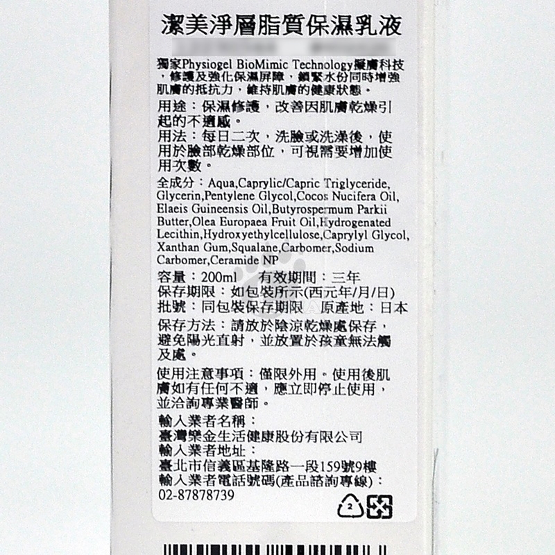 *中文品名:潔美淨層脂質保濕乳液