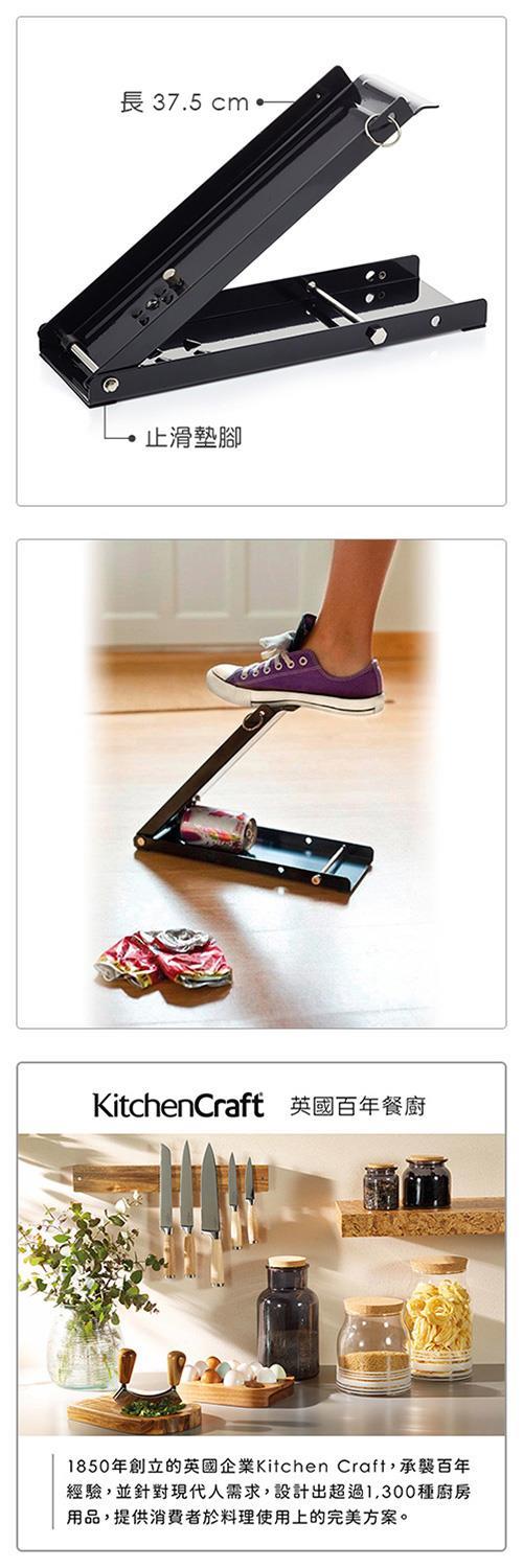 生活中常見的易開罐、寶特瓶,使用上雖便利,但回收時體積卻十分占空間,不好收納又難以提拿出家門傾倒。推薦您此款實用的壓罐器,使用前需先將橫槓安裝於置物面,裝置完成後將目標放置於置物區,再以腳踩下壓踏板,便可輕鬆將鐵鋁罐壓扁,省時省力、有效節省收納空間更環保,予您更方便的生活體驗。