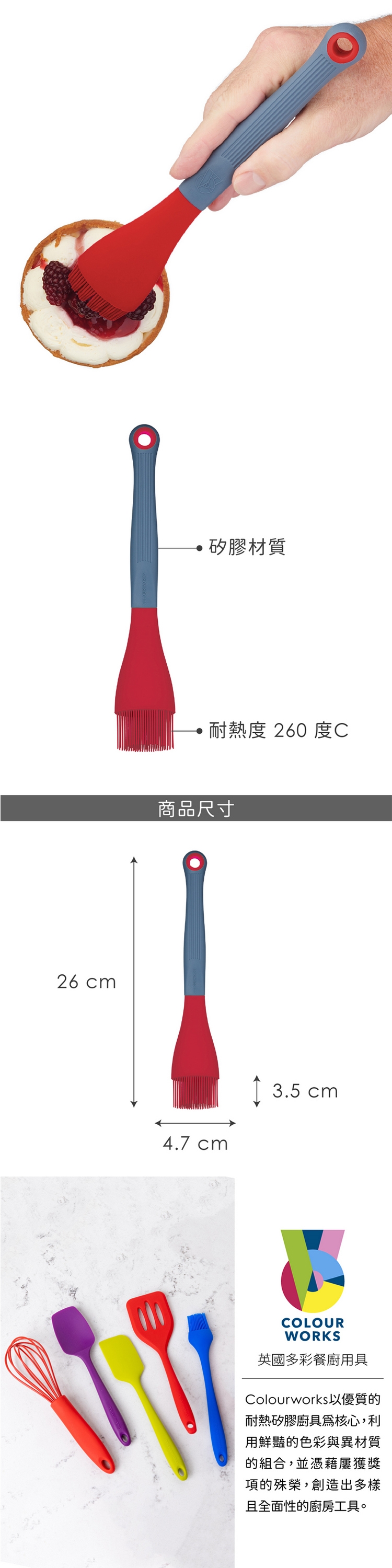 ※ 矽膠材質耐高溫,可在烹調時直接塗醬料、奶油於食材或不沾鍋具上;前端微彎的設計讓您方便塗抹醬料。