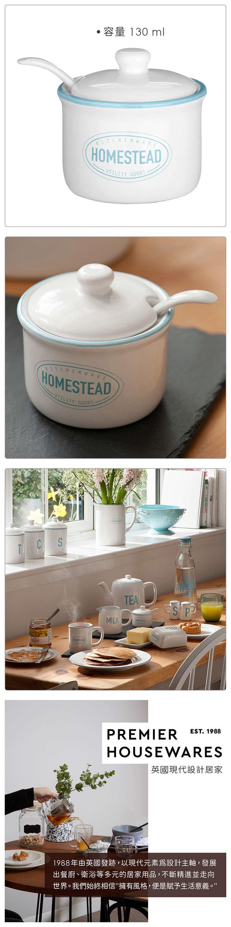 廚房裡的砂糖、鹽巴、方糖等各式調味料,常會需要收納罐來作存放。此款調味罐可裝入各式調味料,一側可放置舀匙的開口設計讓您方便舀取;純白色罐身搭配天藍色圍邊,凸顯淡雅質樸氛圍,陶製材質觸感溫潤,增添用餐時的氛圍。