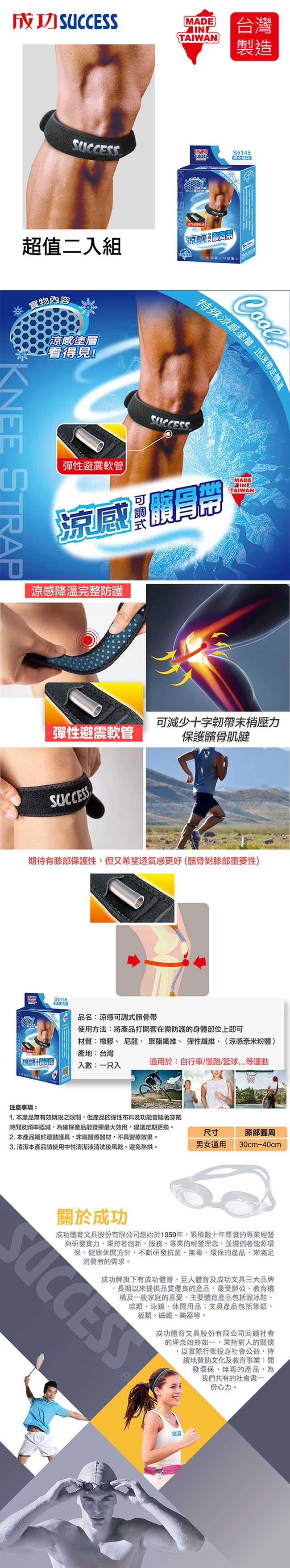 成功SUCCESS 涼感可調式髕骨帶 S5145(2入組)台灣製
