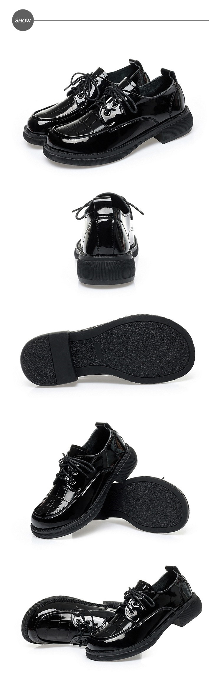 【MOM】休閒鞋 繫帶休閒鞋/真皮亮漆皮時尚壓紋寬楦個性英倫風繫帶休閒鞋 黑